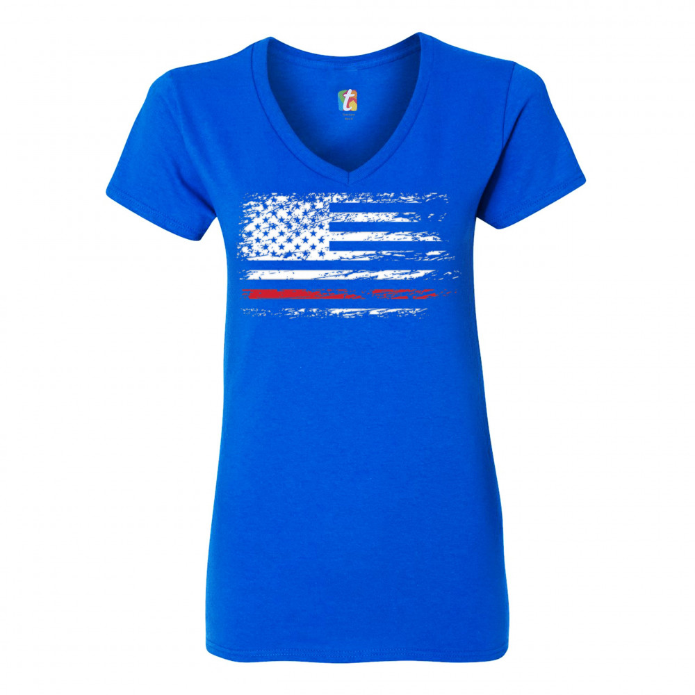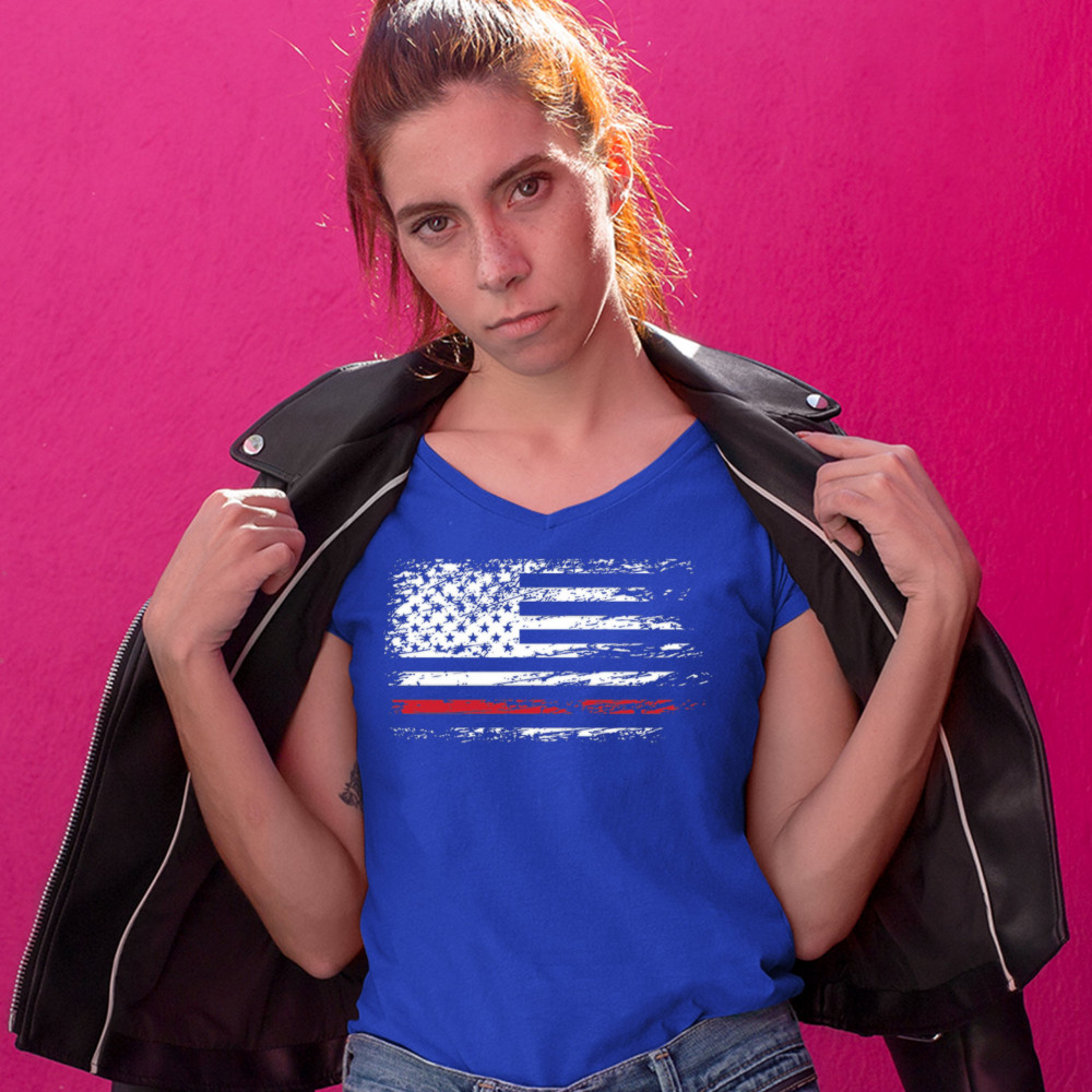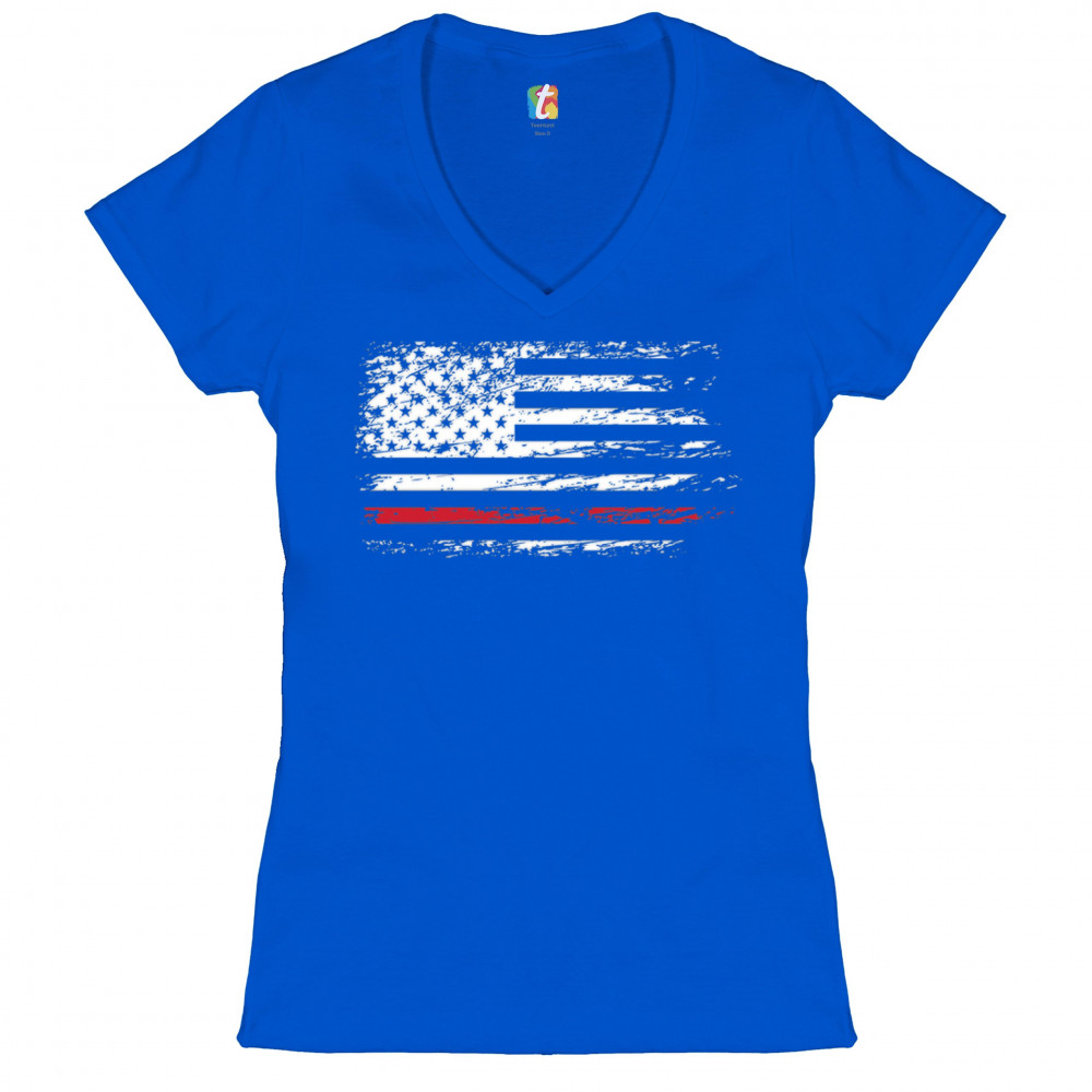 DISTRESSED AMERICAN FLAG women's v-neck t-shirt thind red line firefighter tee royal blue