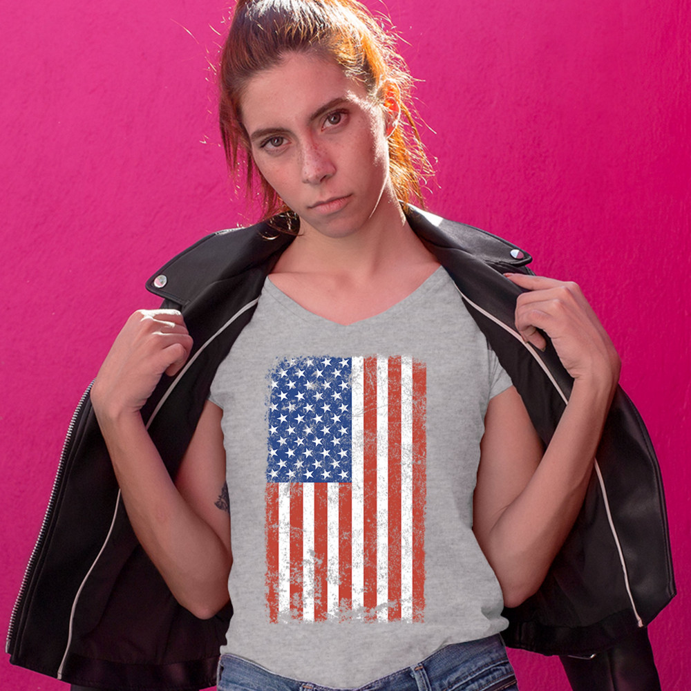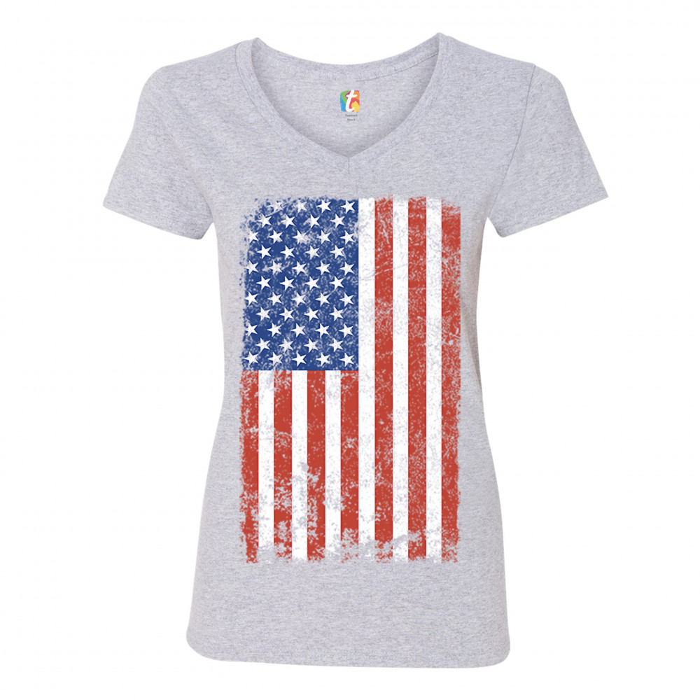 DISTRESSED GRUNGE AMERICAN FLAG women's v-neck t-shirt vintage 4th of july tee gray