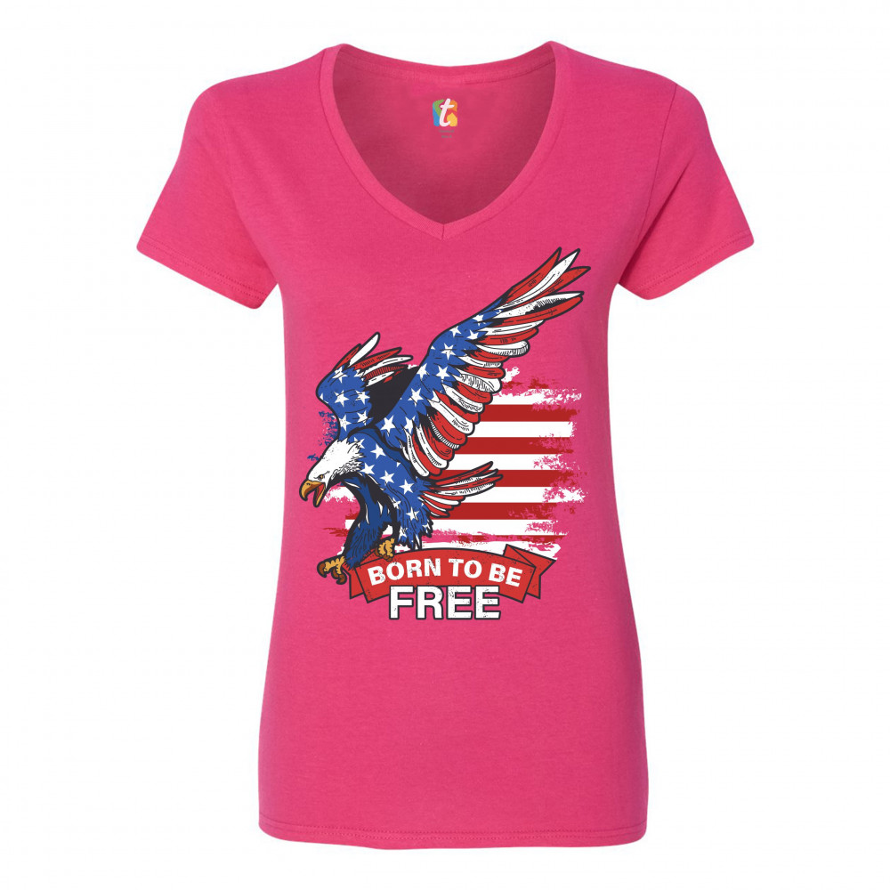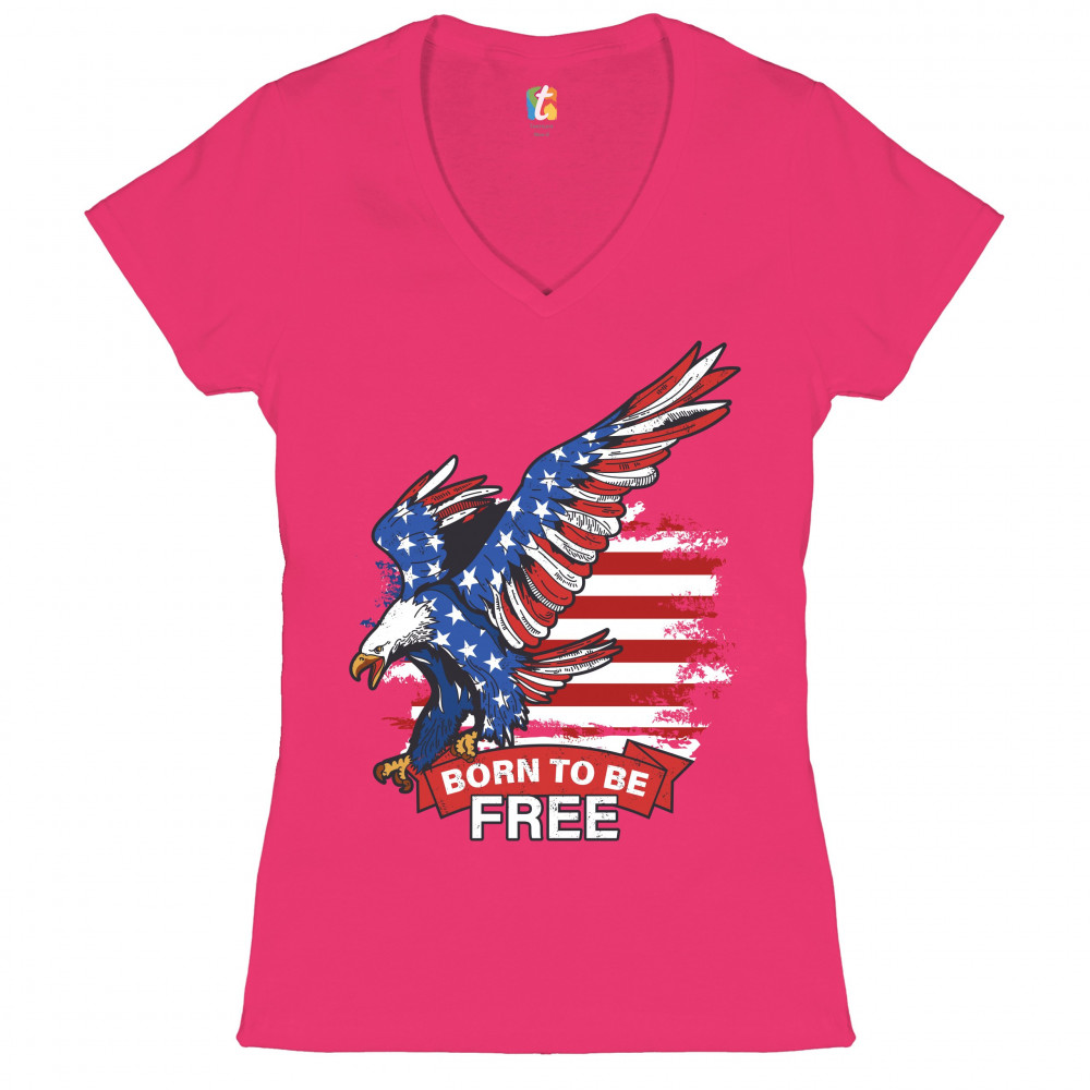 A patriotic print saying "Born to Be Free" and featuring a diving American Bald Eagle. In the background there is a distressed American Flag and the eagle is covered with Stars and Stripes. Great choice to wear on Independence Day or any other patriotic h