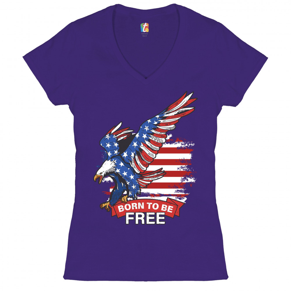 A patriotic print saying "Born to Be Free" and featuring a diving American Bald Eagle. In the background there is a distressed American Flag and the eagle is covered with Stars and Stripes. Great choice to wear on Independence Day or any other patriotic h