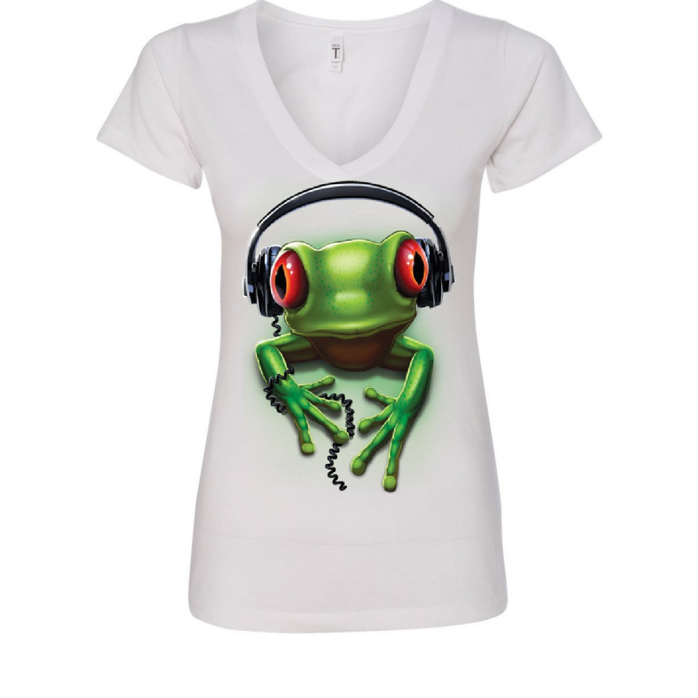 DJ FROG WITH HEADPHONES women's v-neck t-shirt cute animal music wildlife rock white