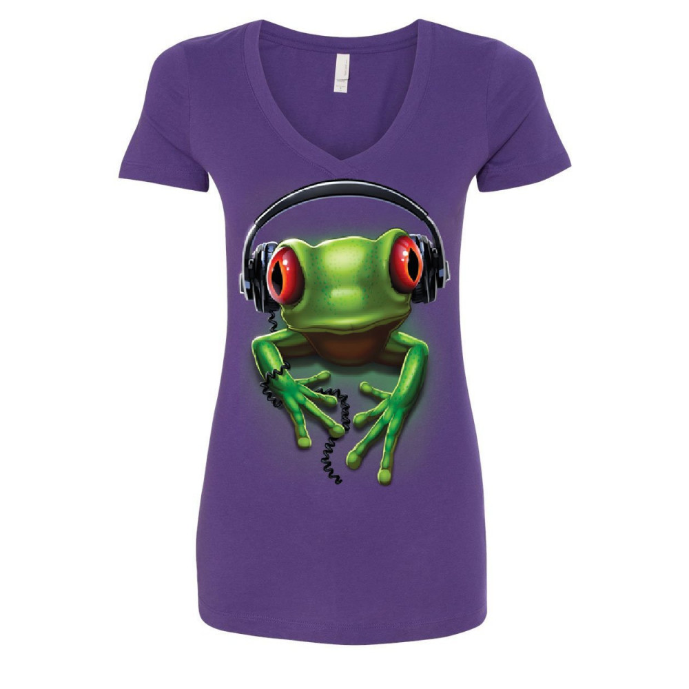 DJ FROG WITH HEADPHONES women's v-neck t-shirt cute animal music wildlife rock purple