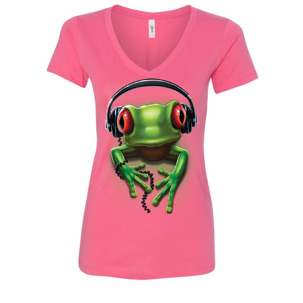 DJ FROG WITH HEADPHONES women's v-neck t-shirt cute animal music wildlife rock pink