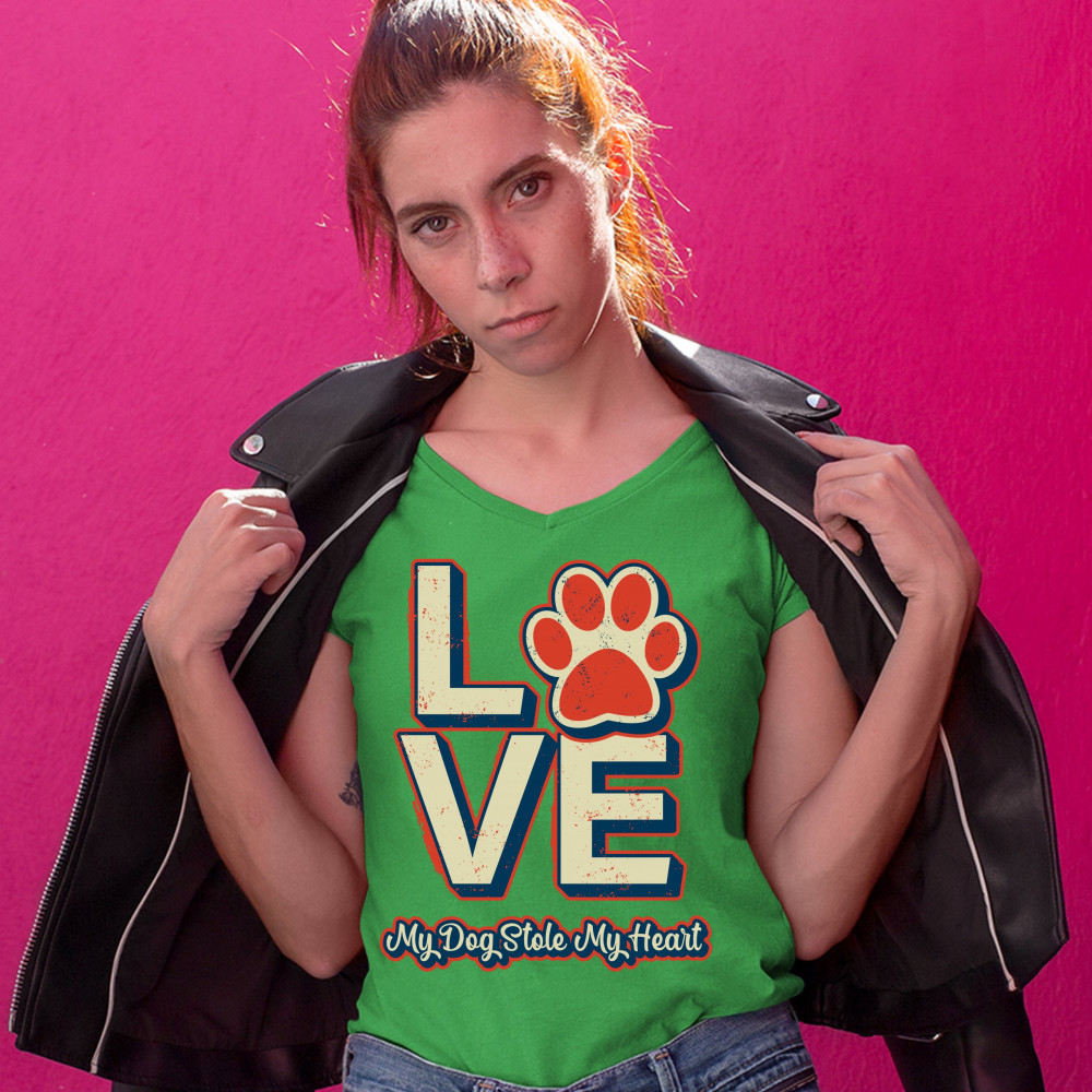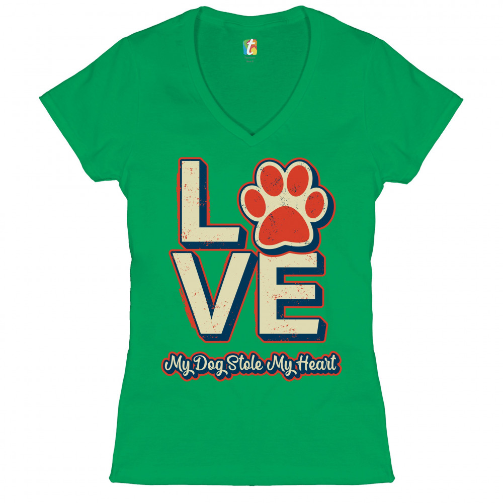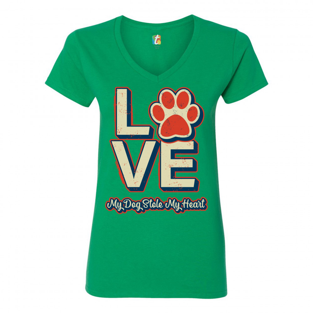 DOG PAW LOVE women's v-neck t-shirt my dog stole my heart animal pet lover tee green