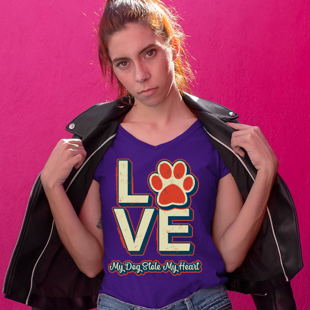 DOG PAW LOVE women's v-neck t-shirt my dog stole my heart animal pet lover tee purple