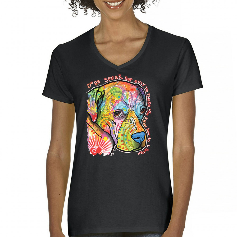 DOGS SPEAK TO THOSE WHO LISTEN women's v-neck t-shirt dean russo neon pet tee black