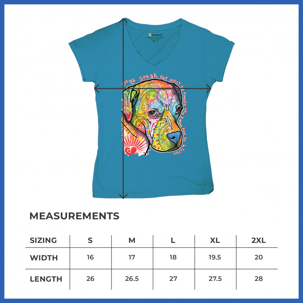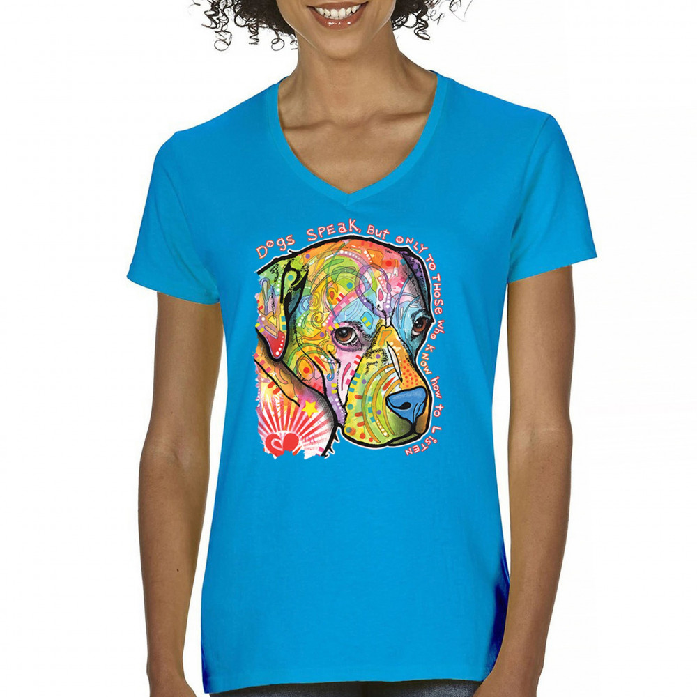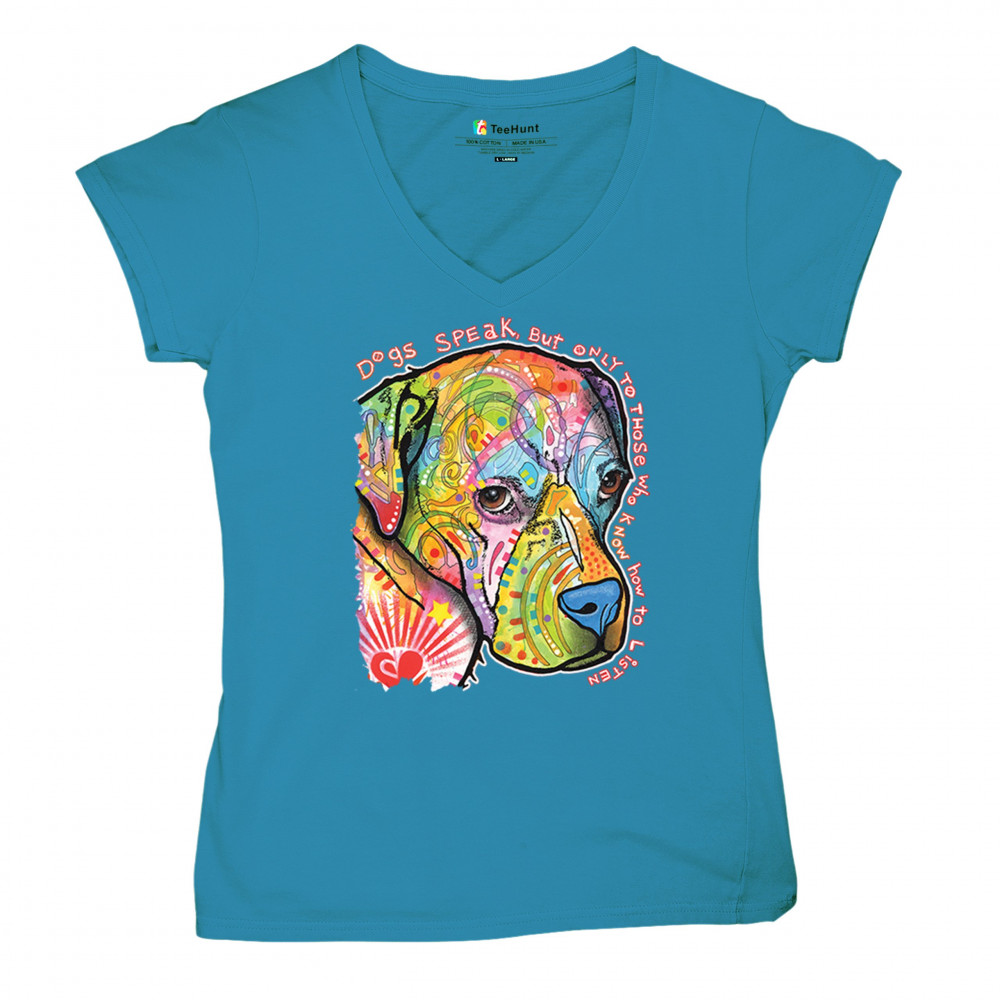 DOGS SPEAK TO THOSE WHO LISTEN women's v-neck t-shirt dean russo neon pet tee turquoise