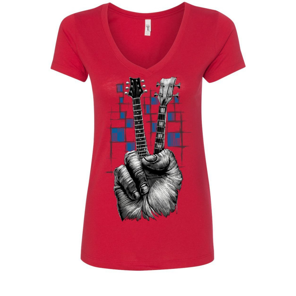 DON'T FRET GUITAR women's v-neck t-shirt rock & roll musician peace sign music red