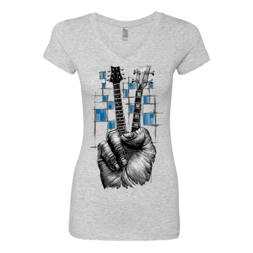 DON'T FRET GUITAR women's v-neck t-shirt rock & roll musician peace sign music gray