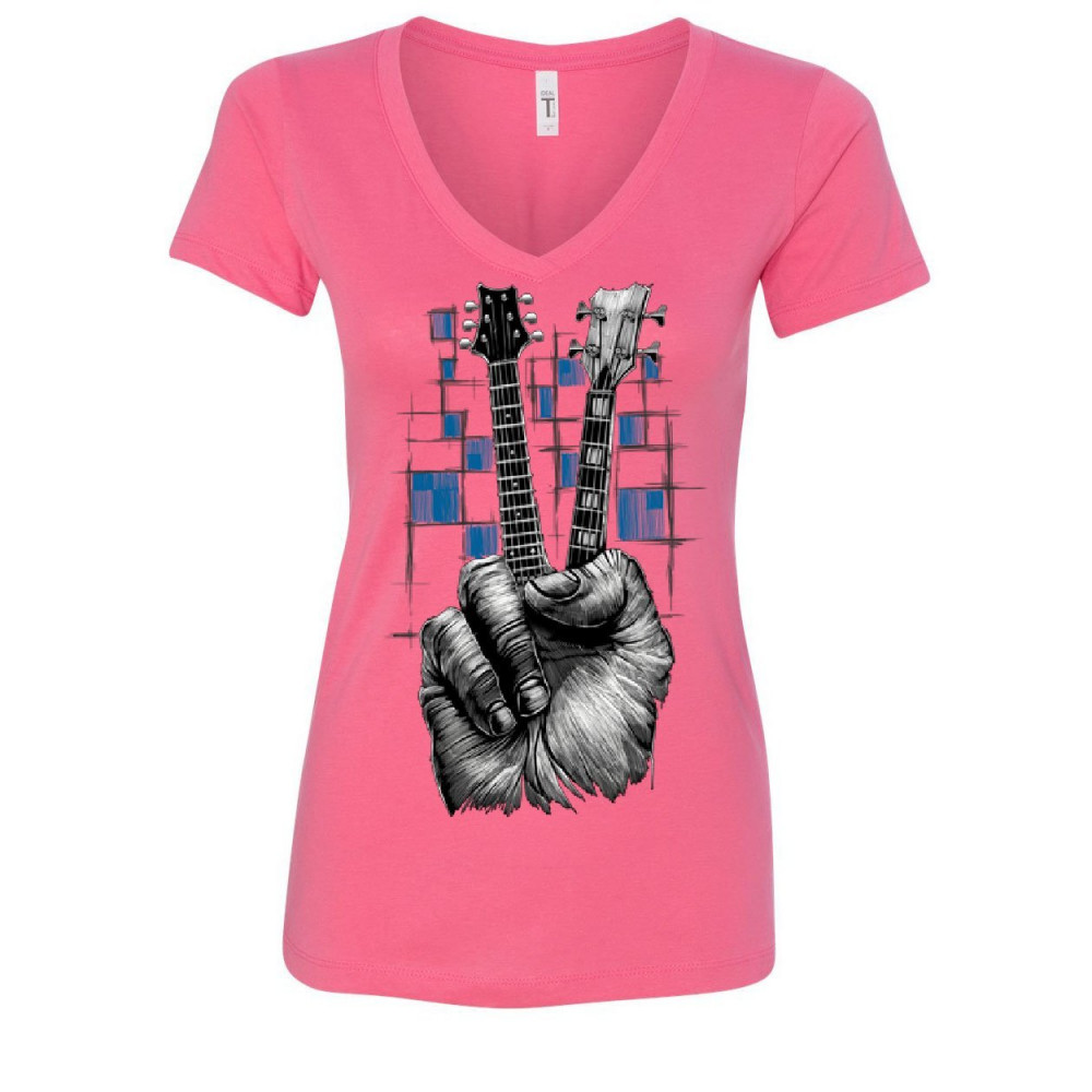 DON'T FRET GUITAR women's v-neck t-shirt rock & roll musician peace sign music pink