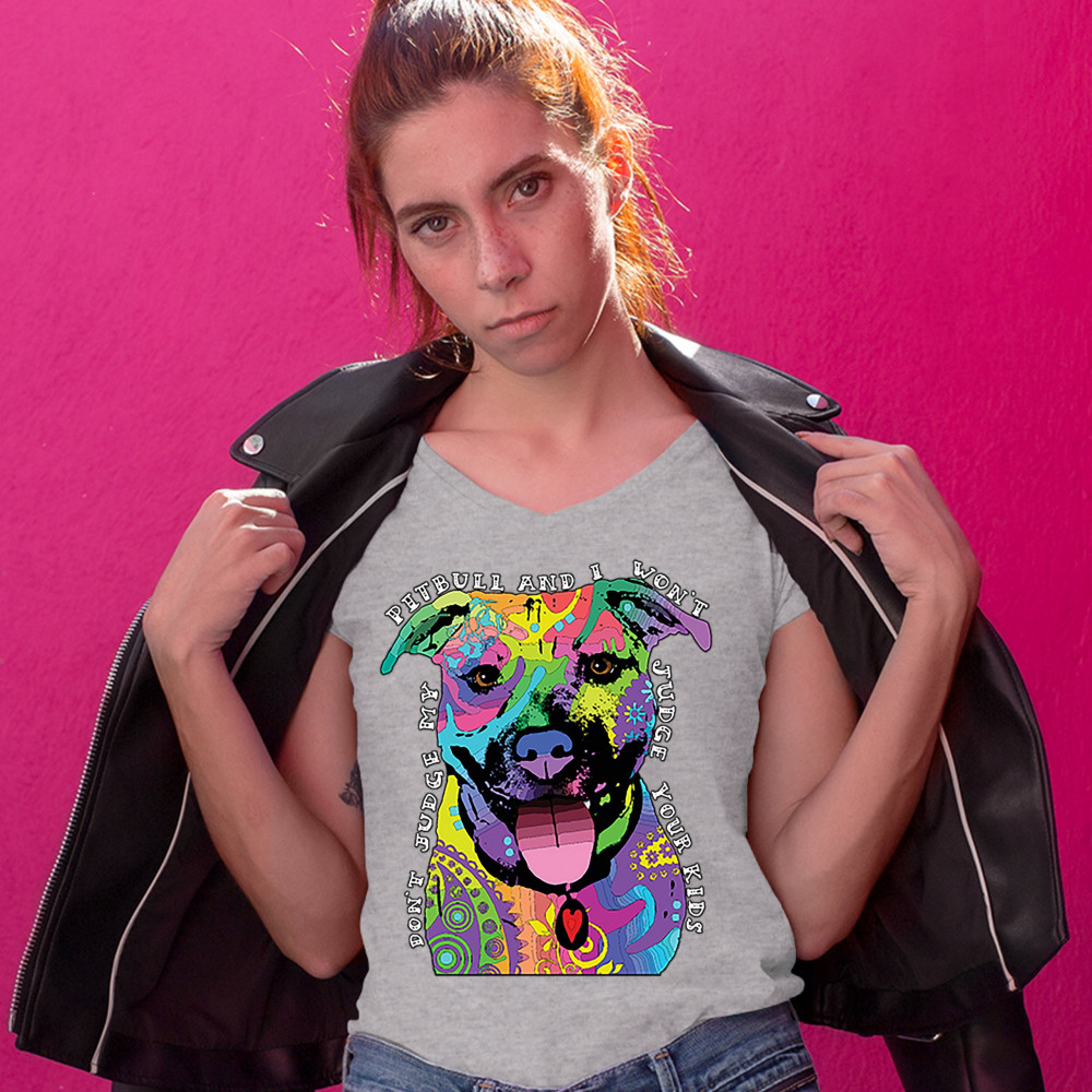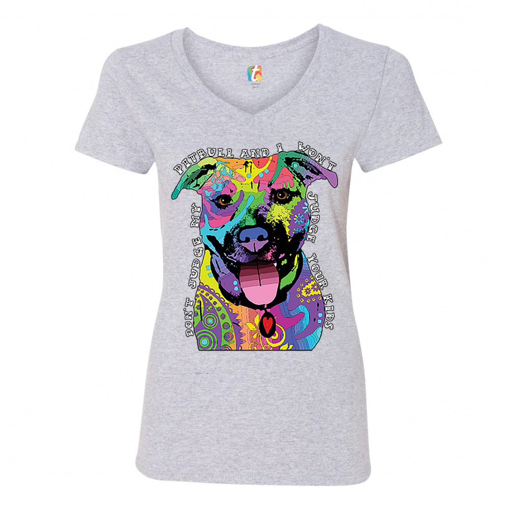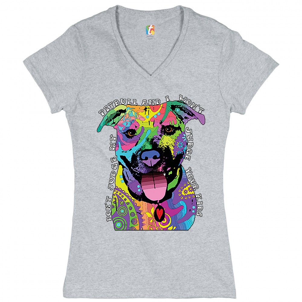DON'T JUDGE MY PIT BULL women's v-neck t-shirt funny andy maxx dog lover tee gray