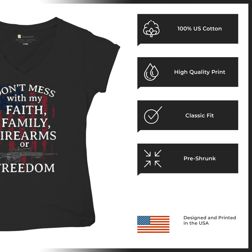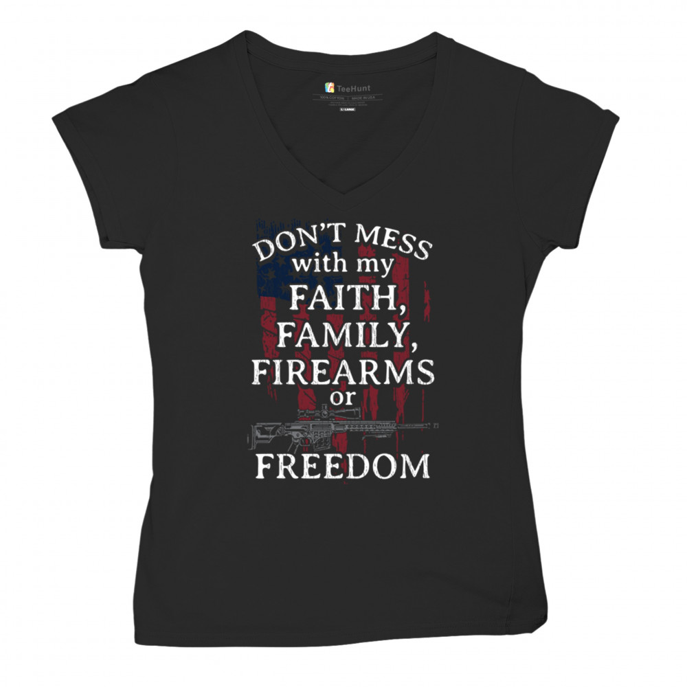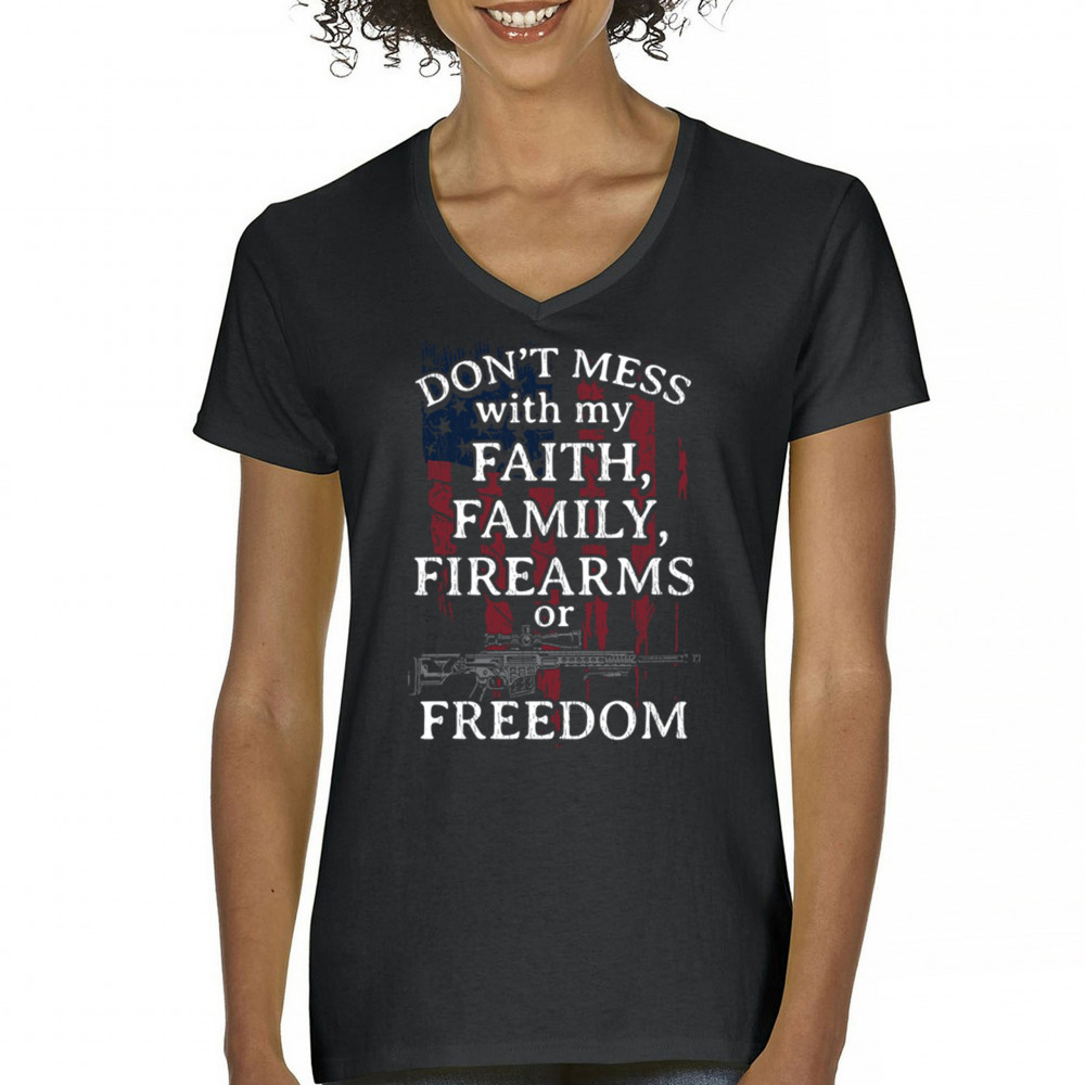 Patriotic shirt with "Don't Mess with My Faith, Family, Firearms, or Freedom" over distressed American flag. Perfect for patriots and veterans.
