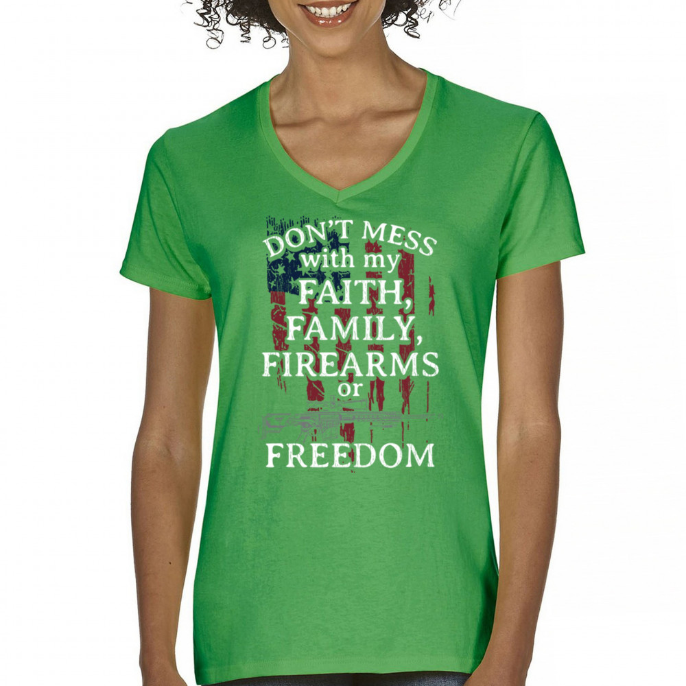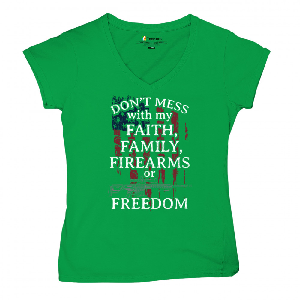 Patriotic shirt with "Don't Mess with My Faith, Family, Firearms, or Freedom" over distressed American flag. Perfect for patriots and veterans.