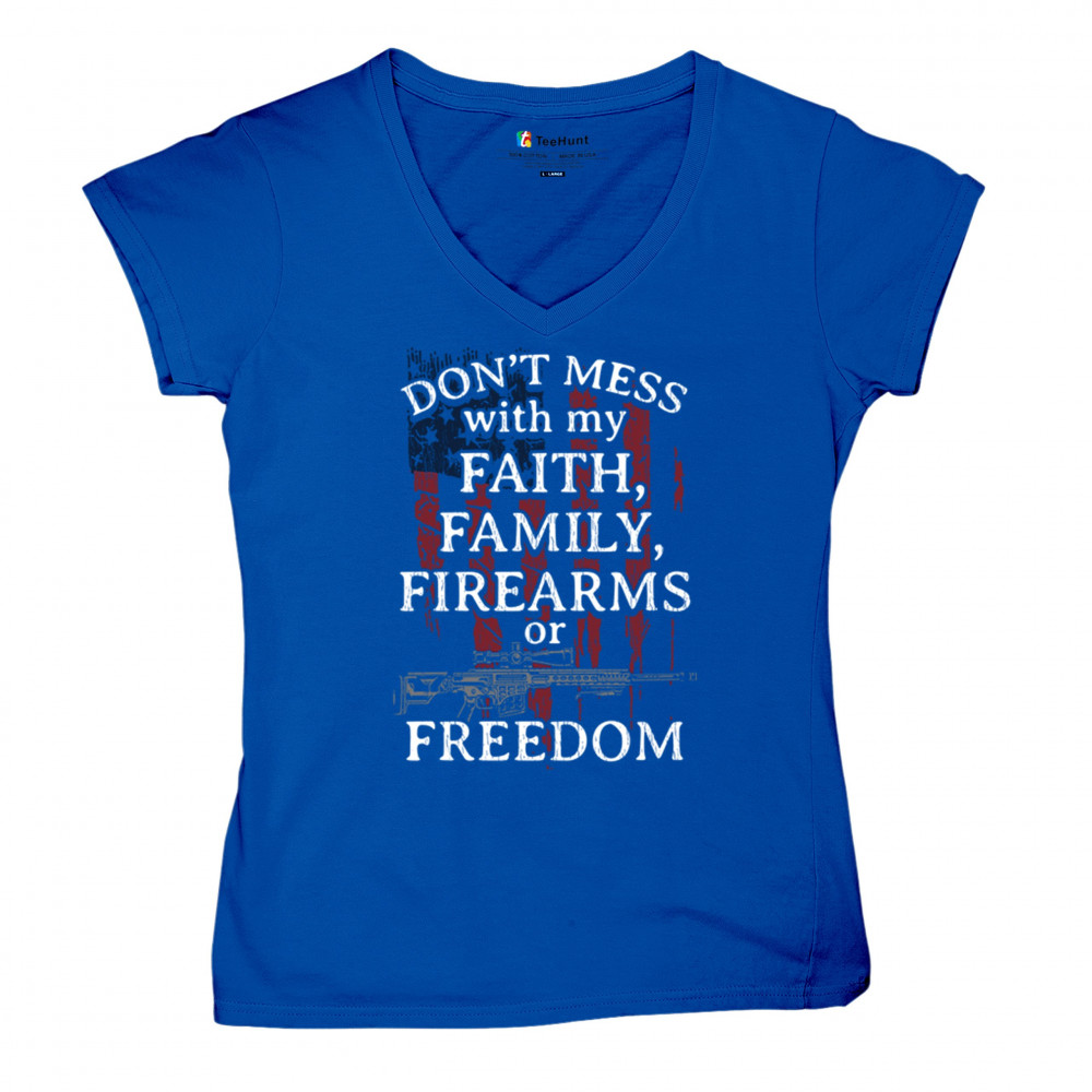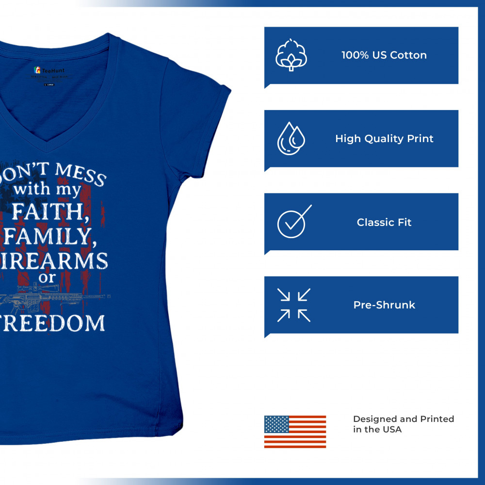 Patriotic shirt with "Don't Mess with My Faith, Family, Firearms, or Freedom" over distressed American flag. Perfect for patriots and veterans.