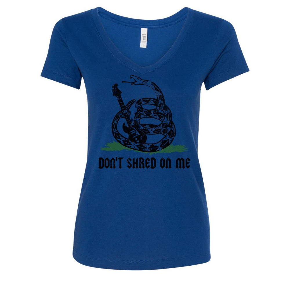 DON'T SHRED ON ME women's v-neck t-shirt gadsden flag snake guitar rock music royal blue