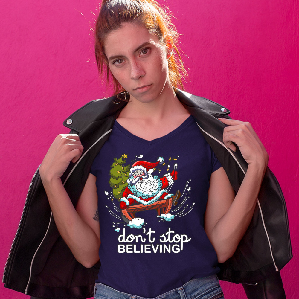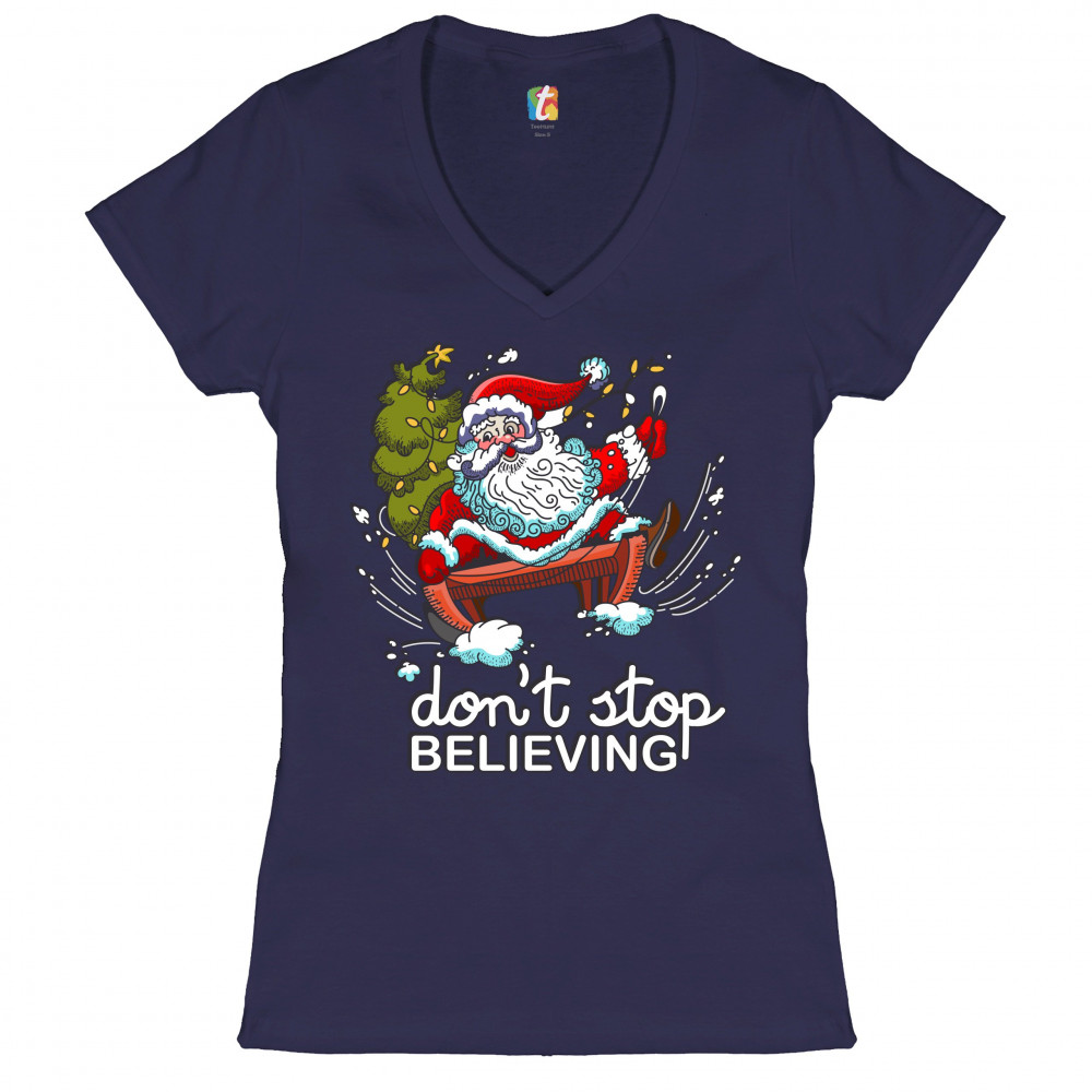 DON'T STOP BELIEVING women's v-neck t-shirt holiday spirit santa claus tee navy blue
