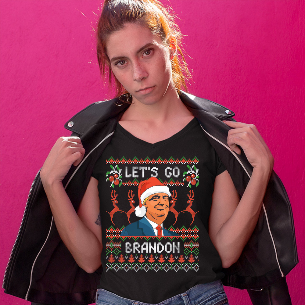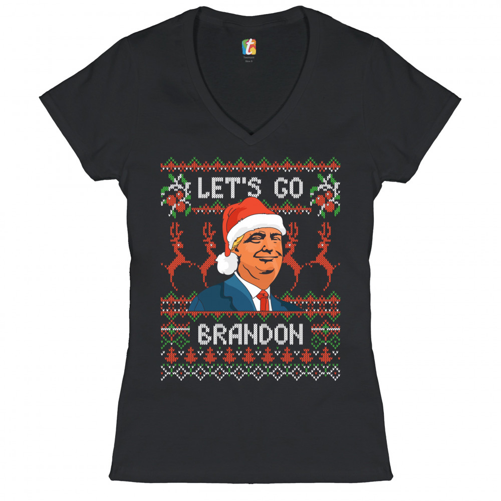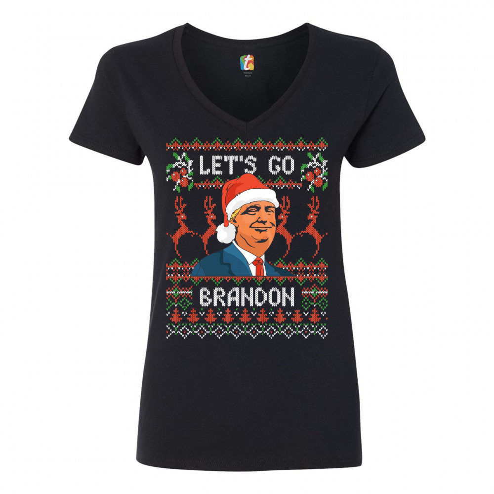 DONALD TRUMP LET'S GO BRANDON donald trump lets go brandon women's v-neck t-shirt christmas ugly sweater tee black