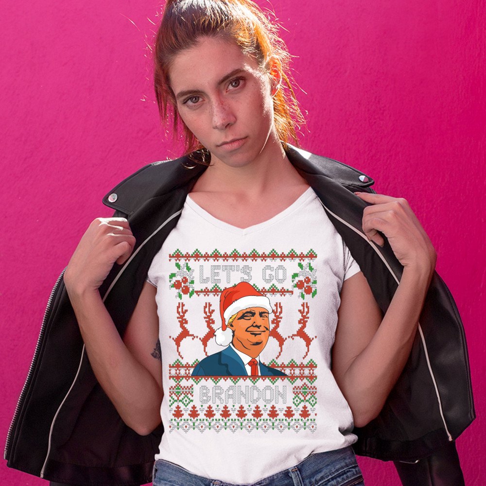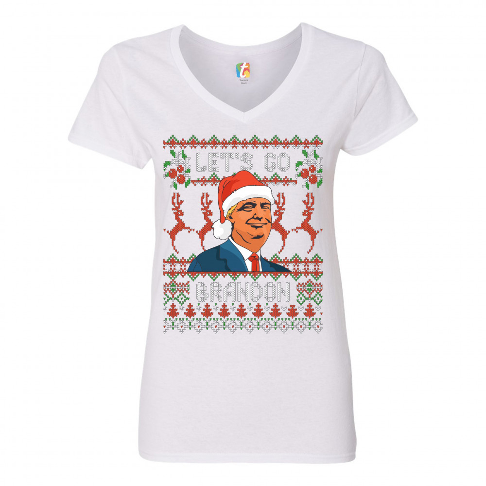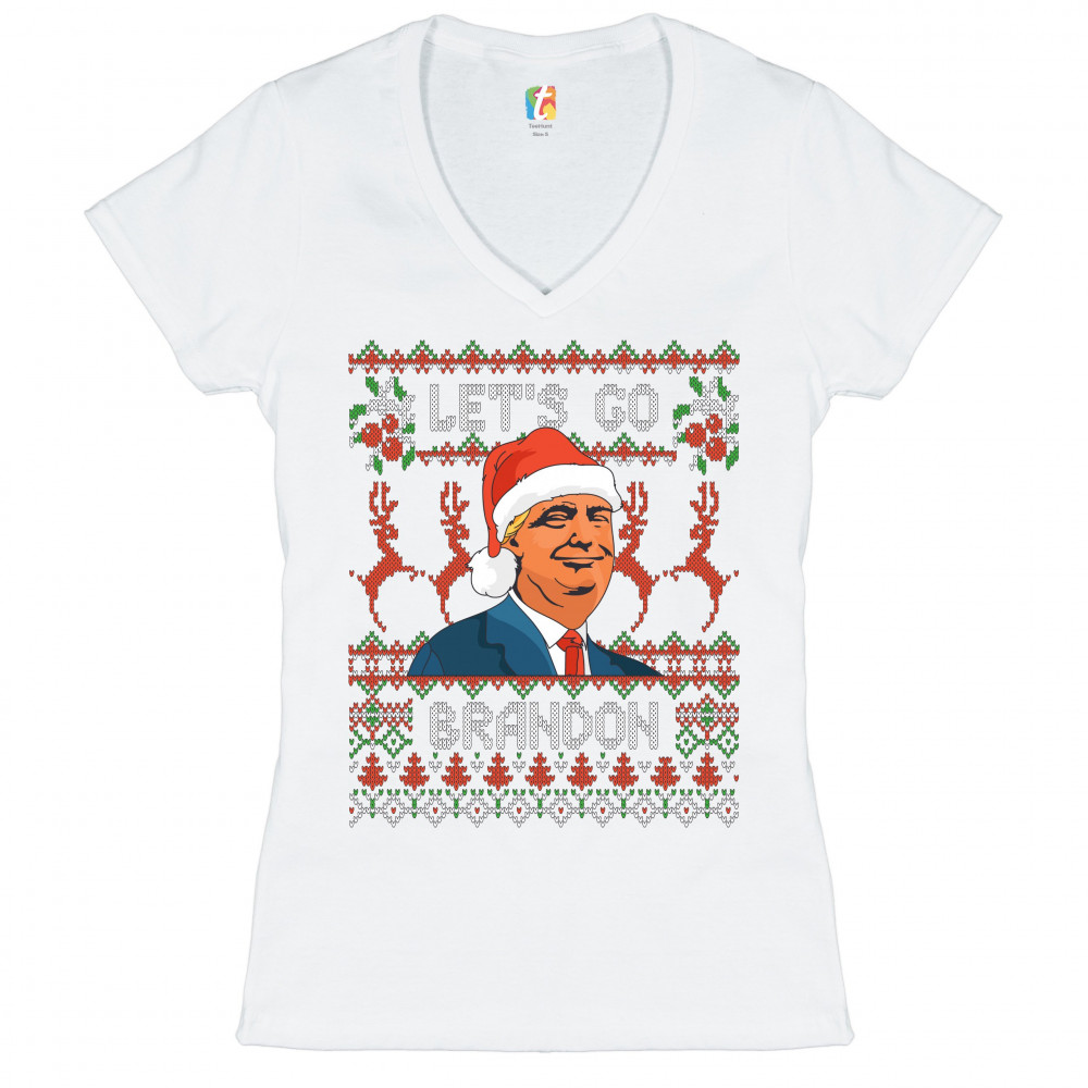 DONALD TRUMP LET'S GO BRANDON donald trump lets go brandon women's v-neck t-shirt christmas ugly sweater tee white