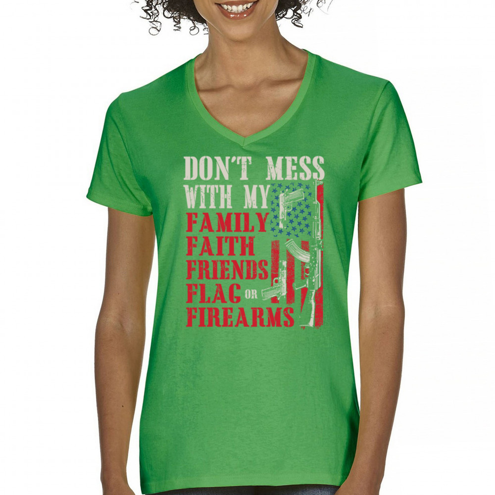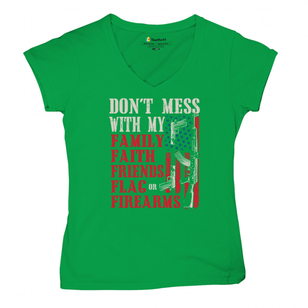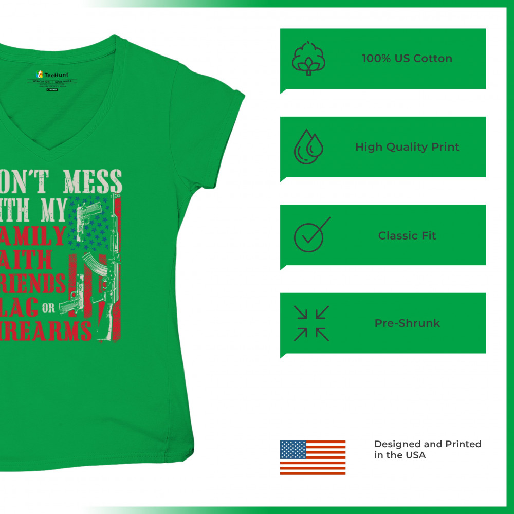 Patriotic design for gun owners and liberty-lovers. Bold message defends family, flag, and firearms with unapologetic American pride.