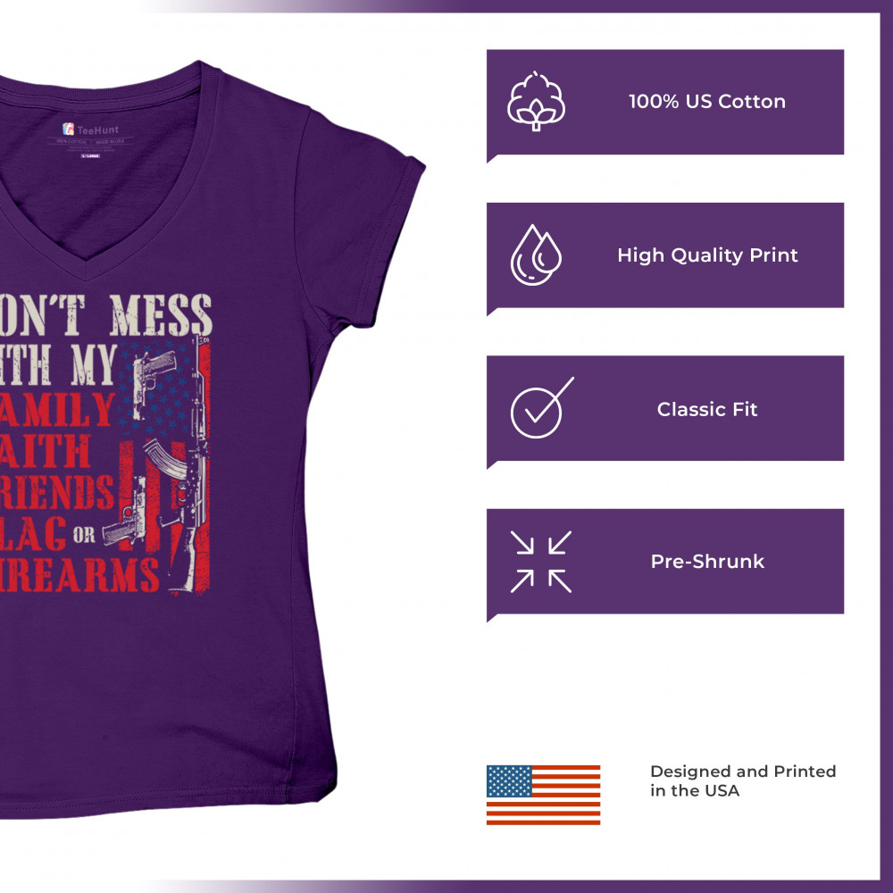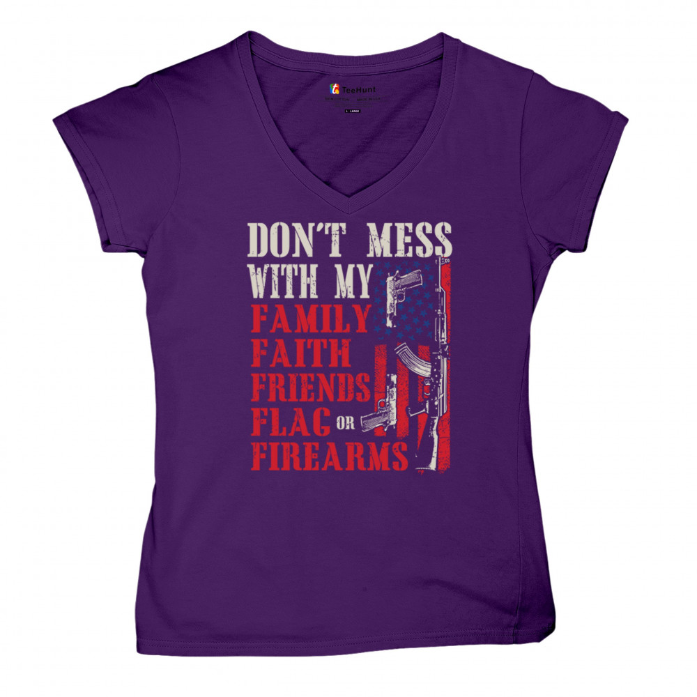 Patriotic design for gun owners and liberty-lovers. Bold message defends family, flag, and firearms with unapologetic American pride.