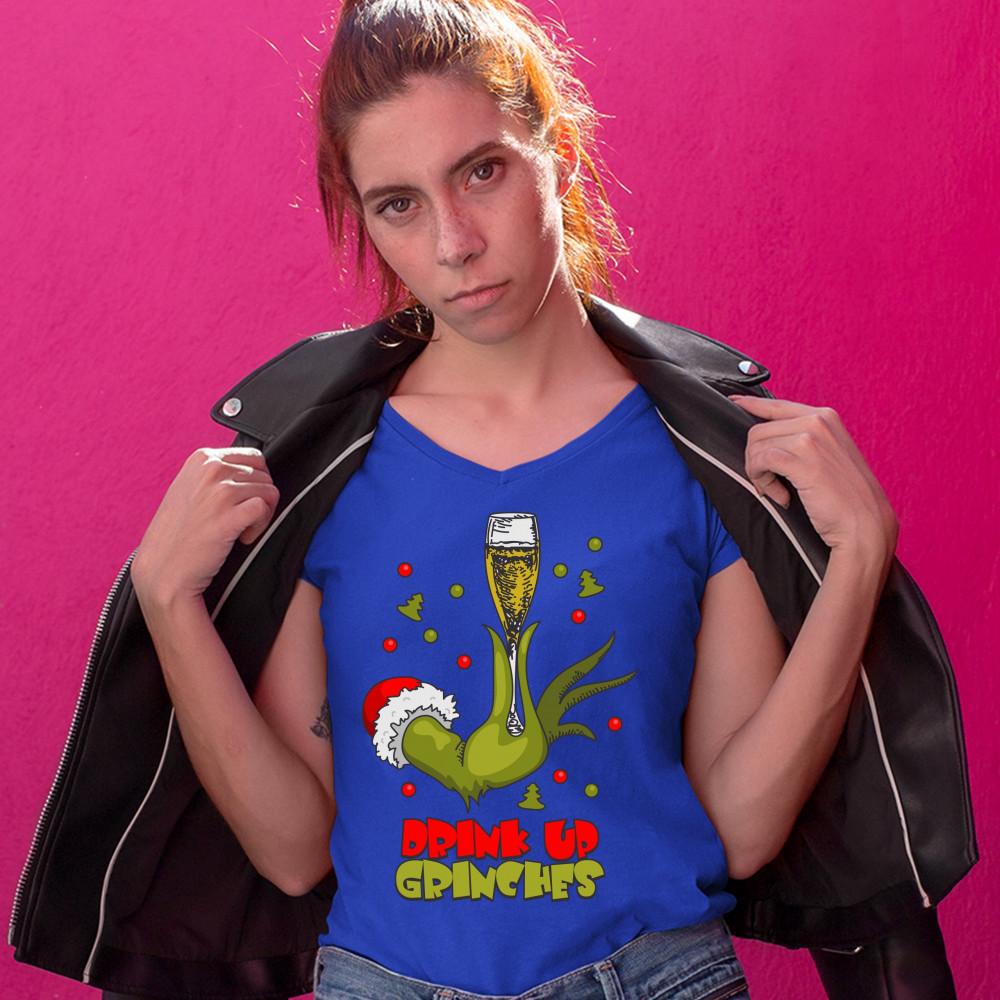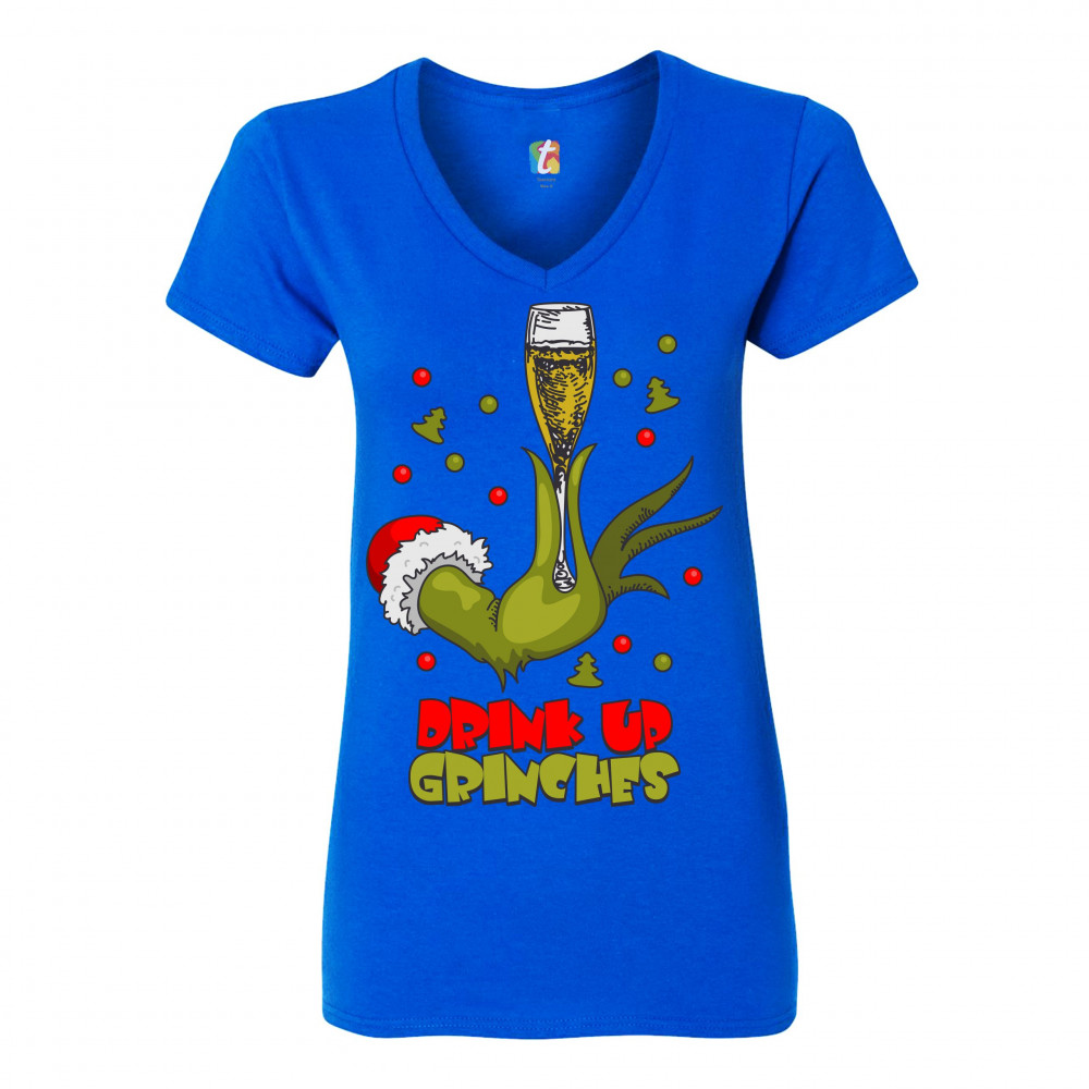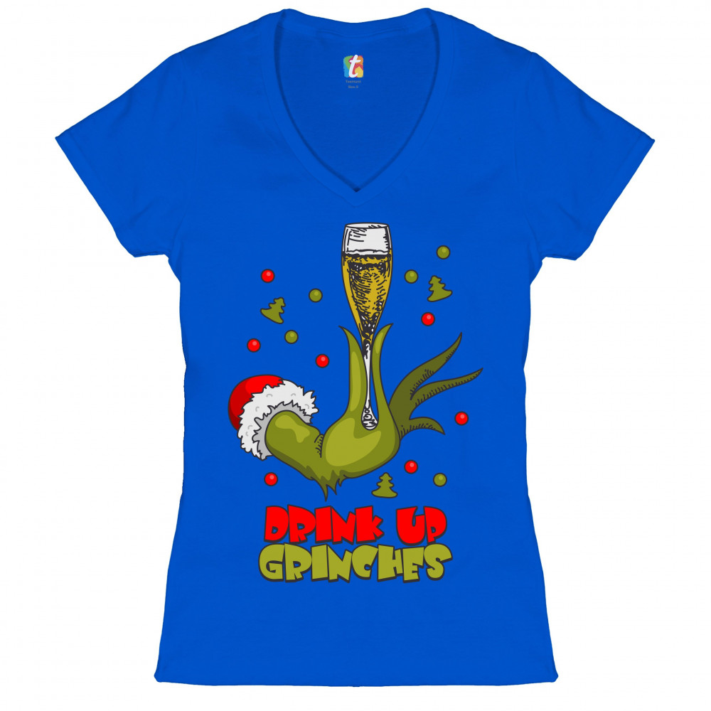 DRINK UP GRINCHES women's v-neck t-shirt funny christmas drinking tee royal blue