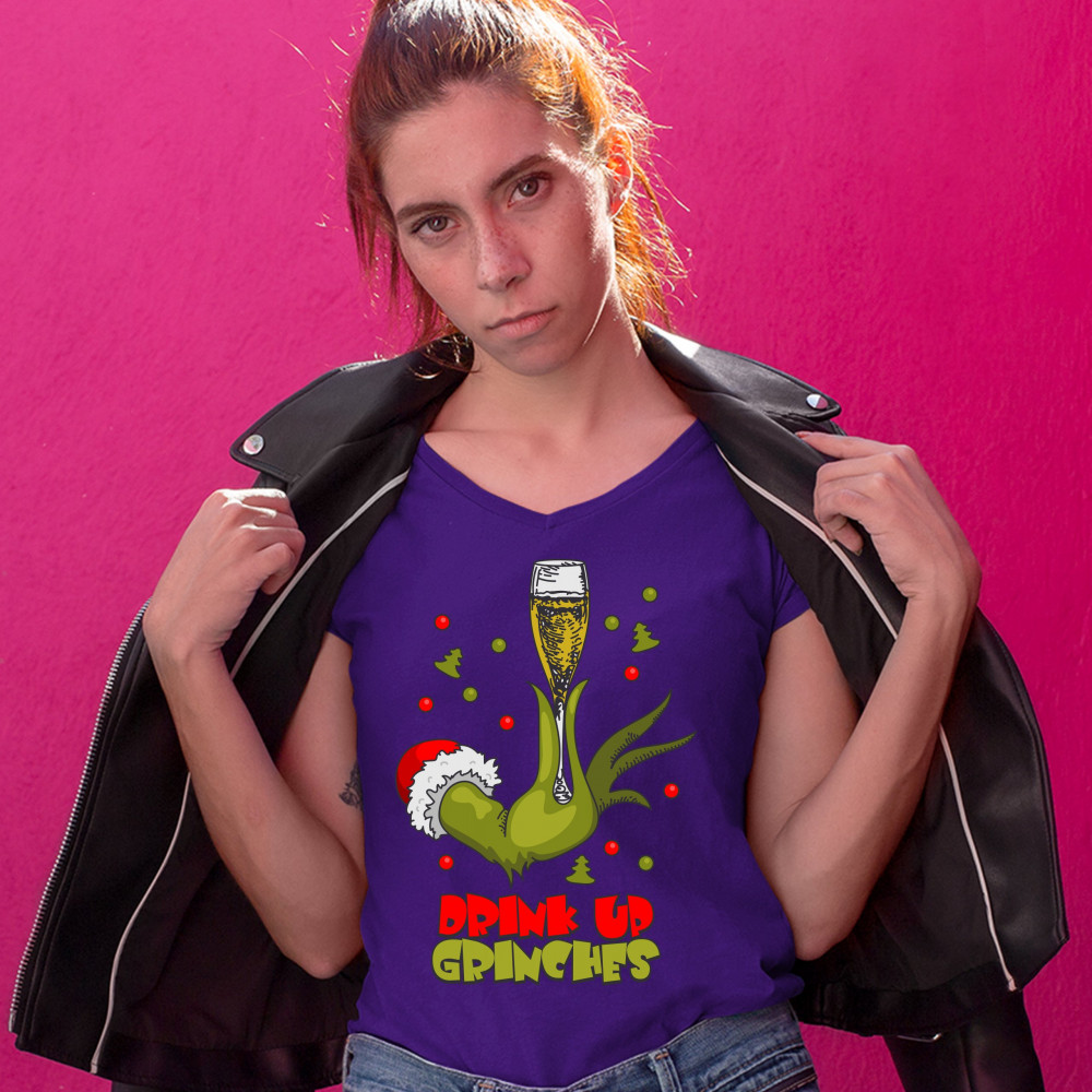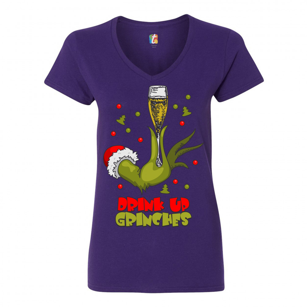 DRINK UP GRINCHES women's v-neck t-shirt funny christmas drinking tee purple