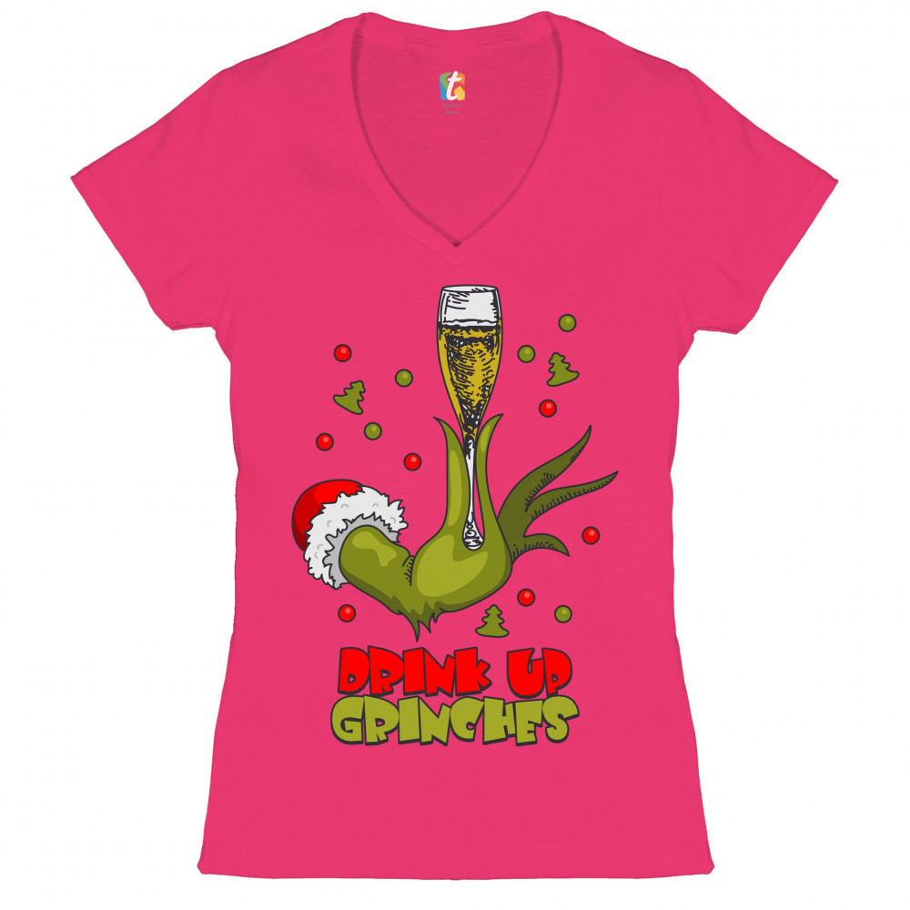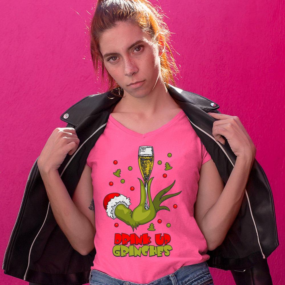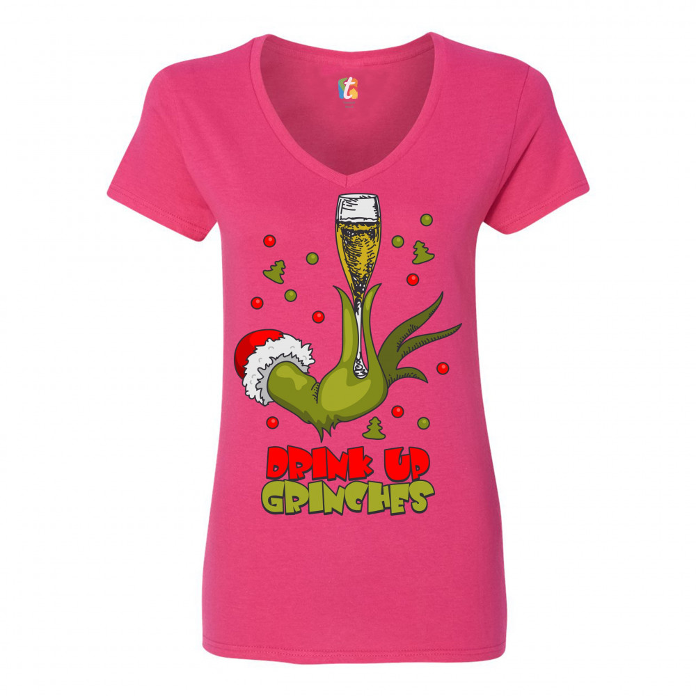DRINK UP GRINCHES women's v-neck t-shirt funny christmas drinking tee pink