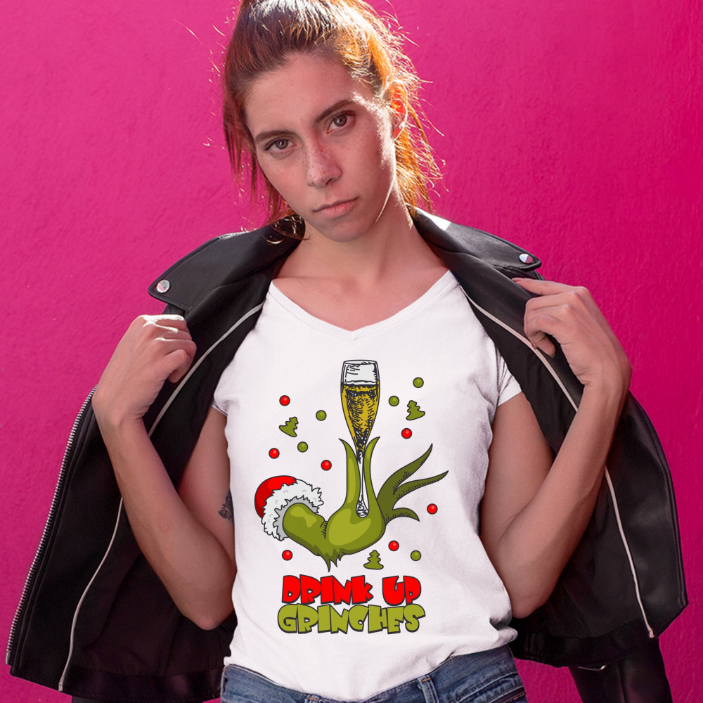 DRINK UP GRINCHES women's v-neck t-shirt funny christmas drinking tee white