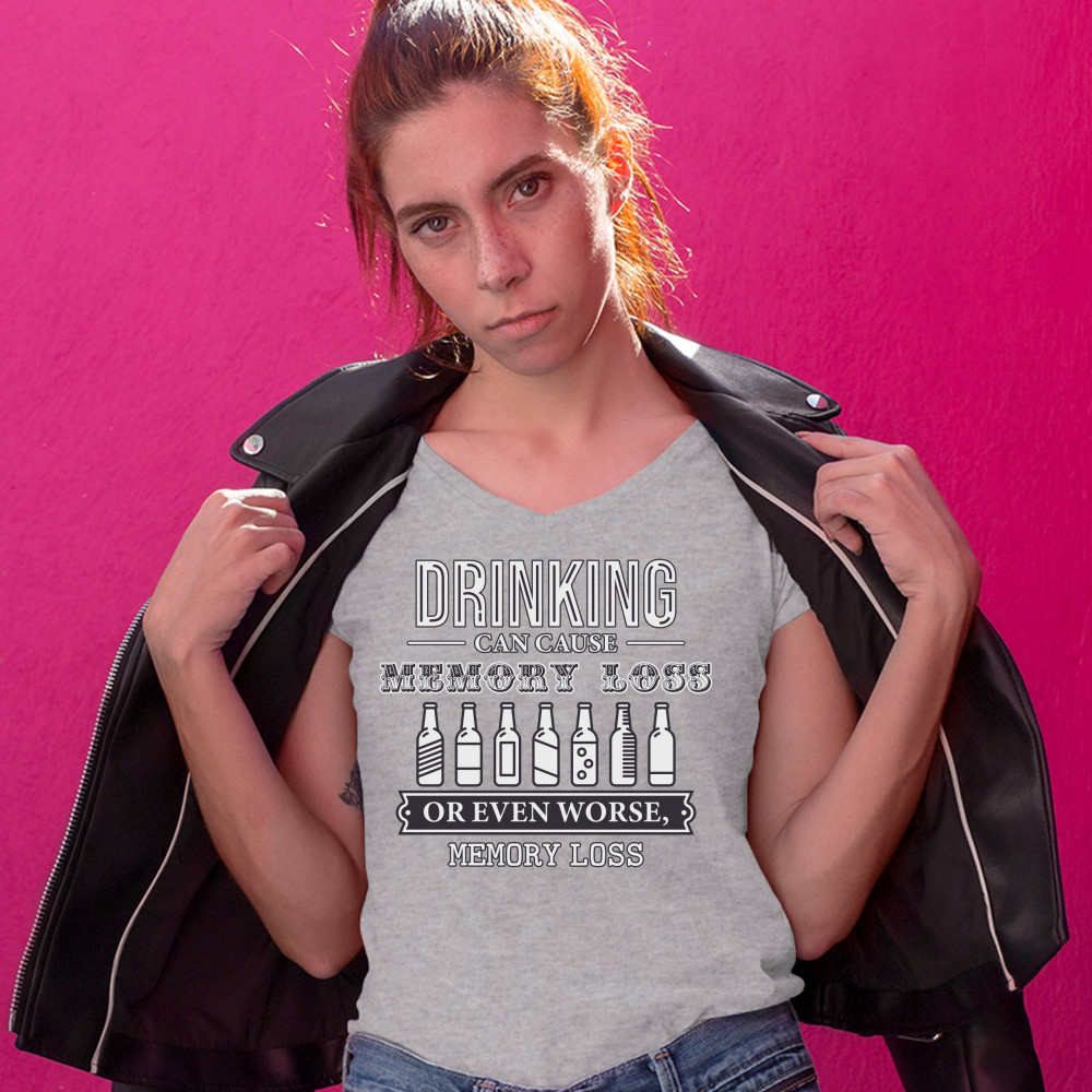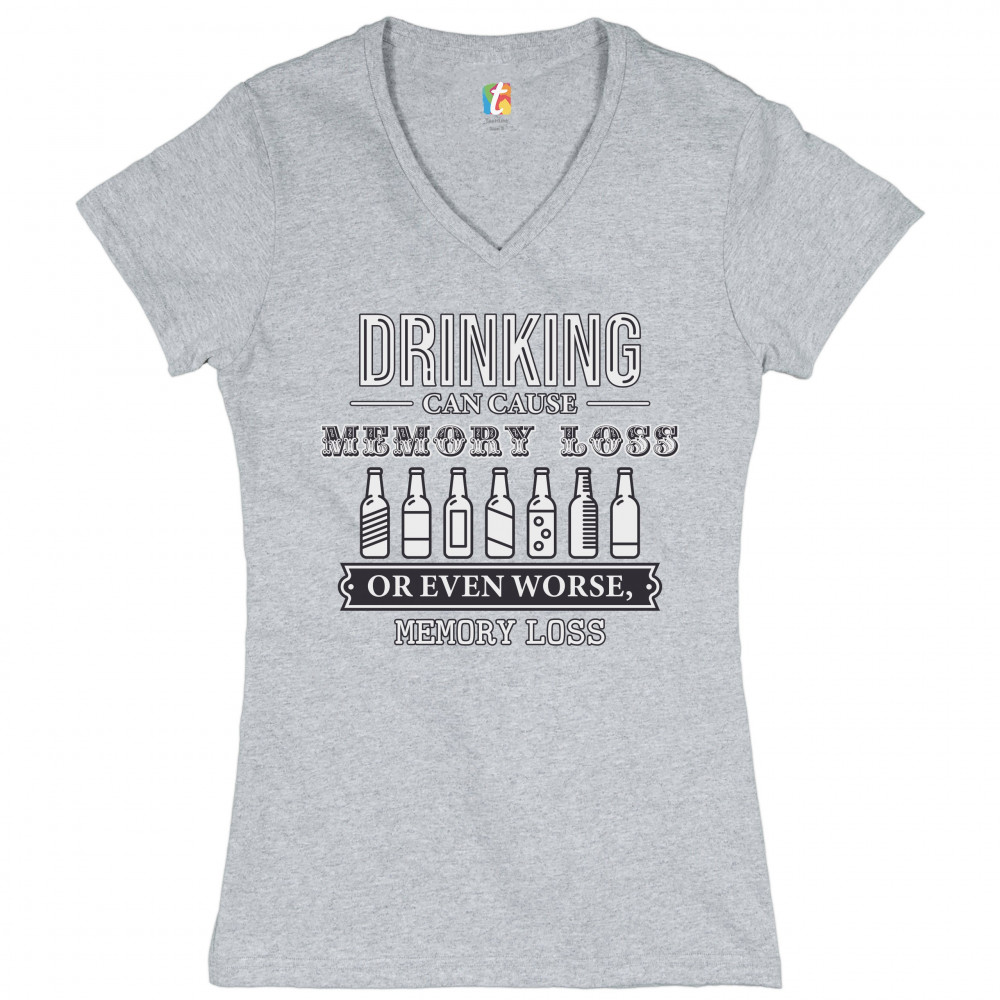 DRINKING CAN CAUSE MEMORY LOSS women's v-neck t-shirt alcohol beer funny tee gray