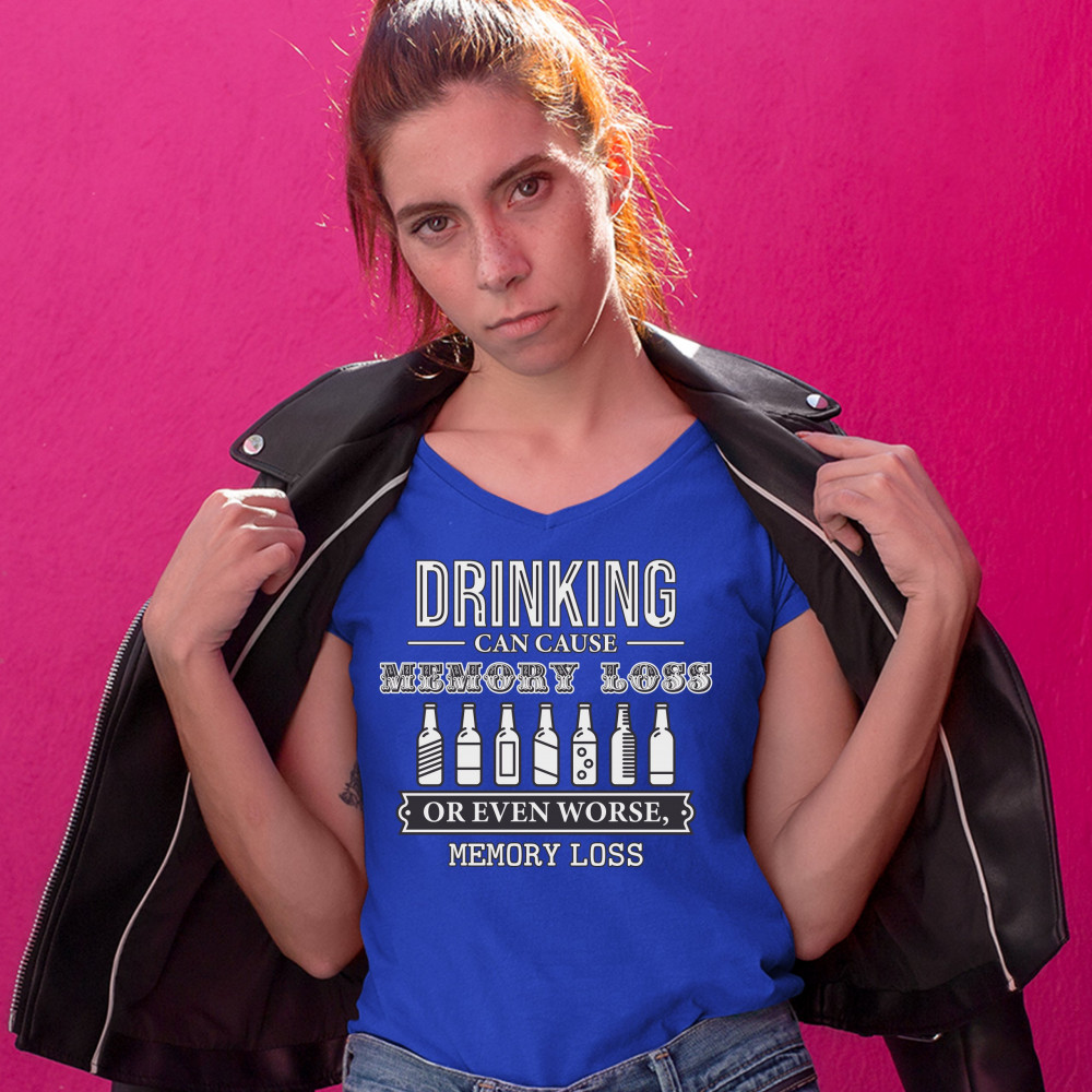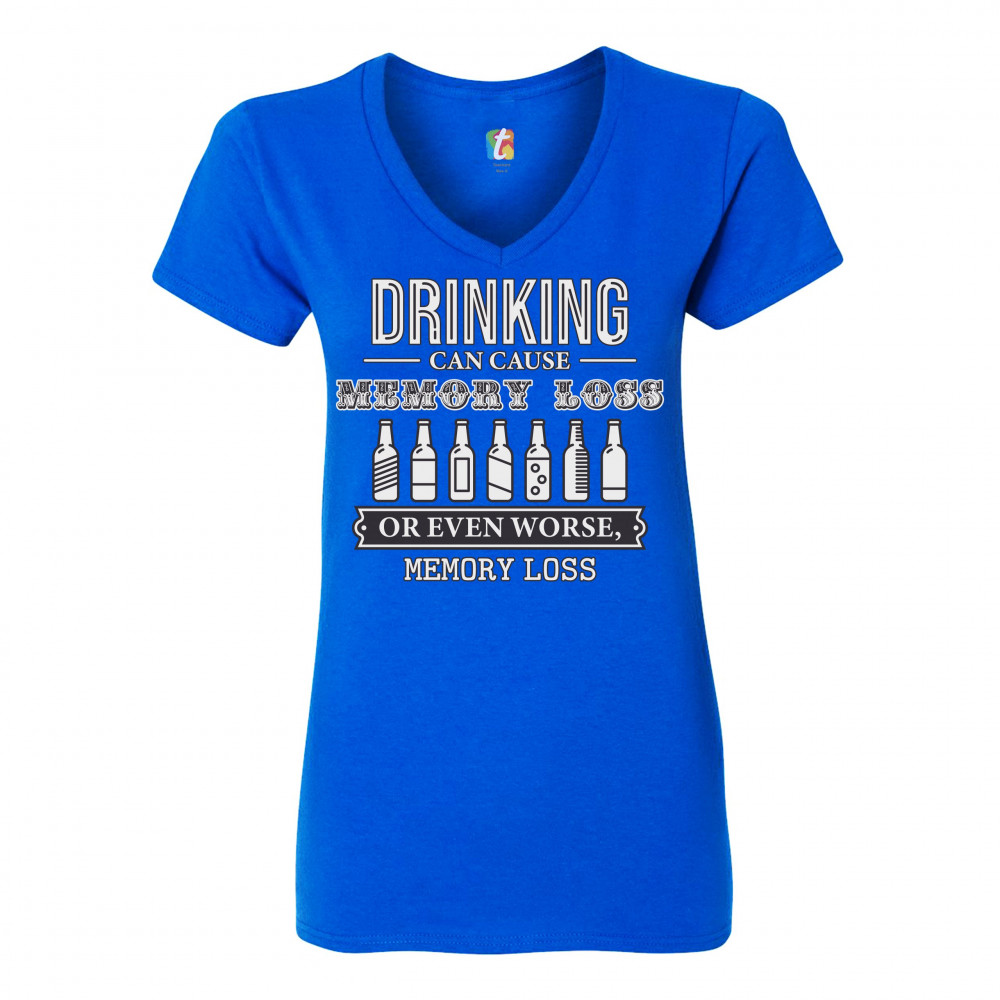 DRINKING CAN CAUSE MEMORY LOSS women's v-neck t-shirt alcohol beer funny tee royal blue