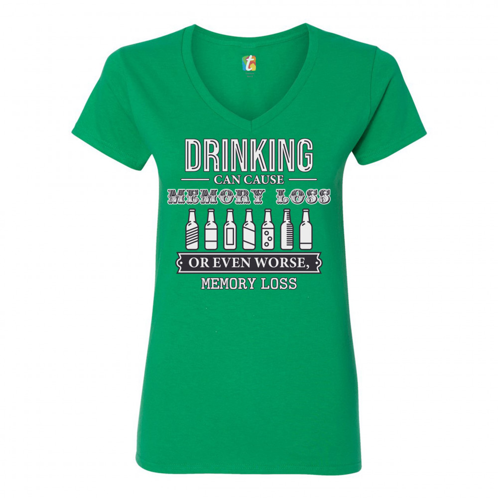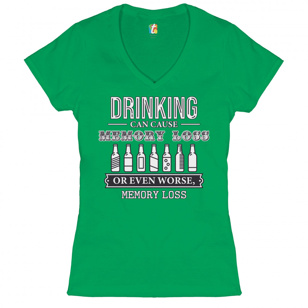 DRINKING CAN CAUSE MEMORY LOSS women's v-neck t-shirt alcohol beer funny tee green