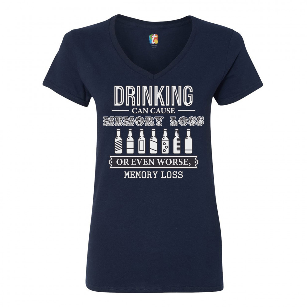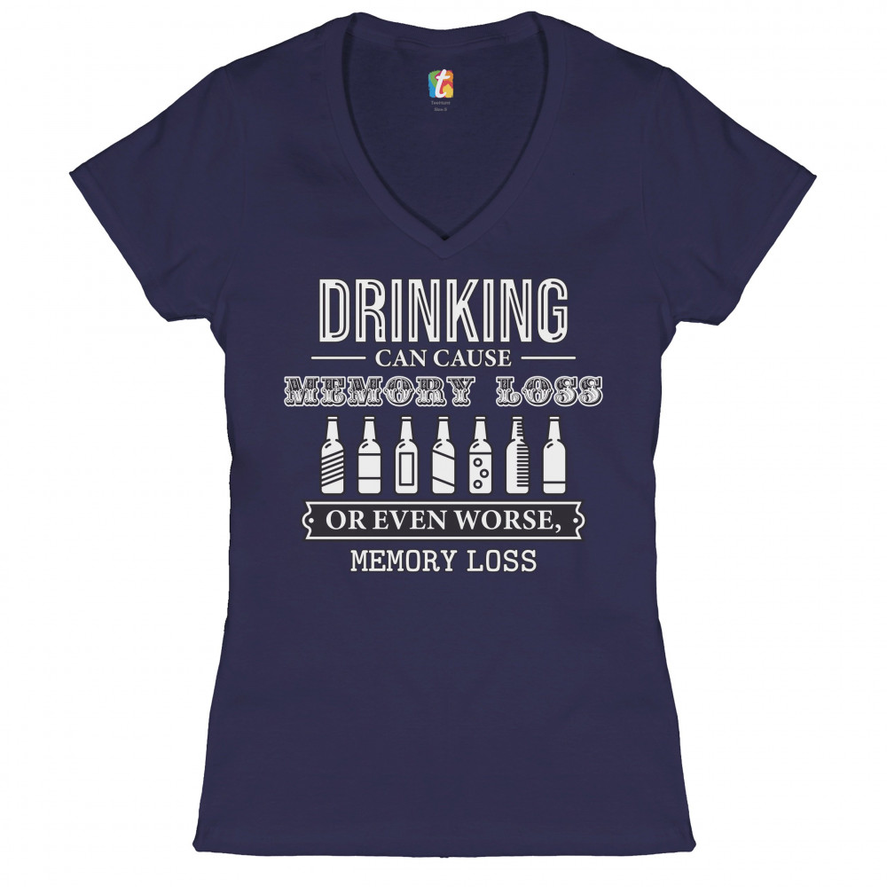 DRINKING CAN CAUSE MEMORY LOSS women's v-neck t-shirt alcohol beer funny tee navy blue