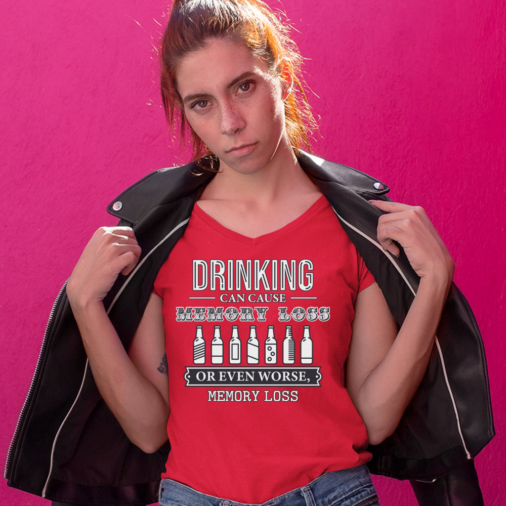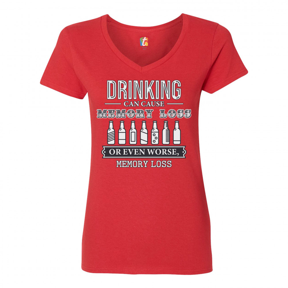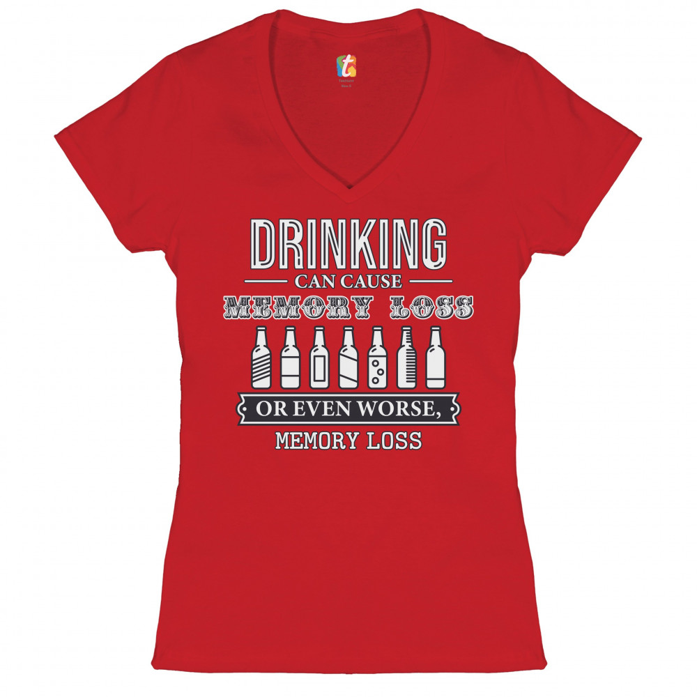 DRINKING CAN CAUSE MEMORY LOSS women's v-neck t-shirt alcohol beer funny tee red