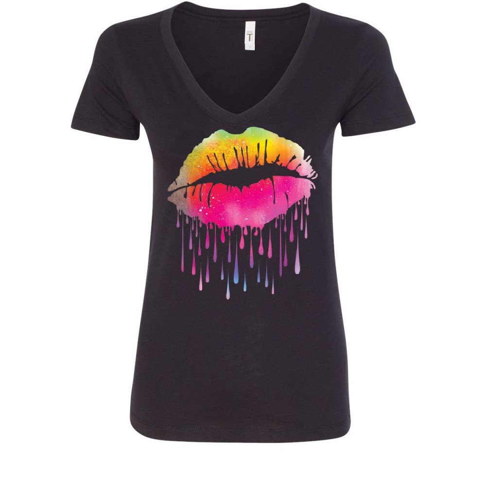 DRIPPING NEON LIPS women's v-neck t-shirt lips like sugar kiss love sexy melt black