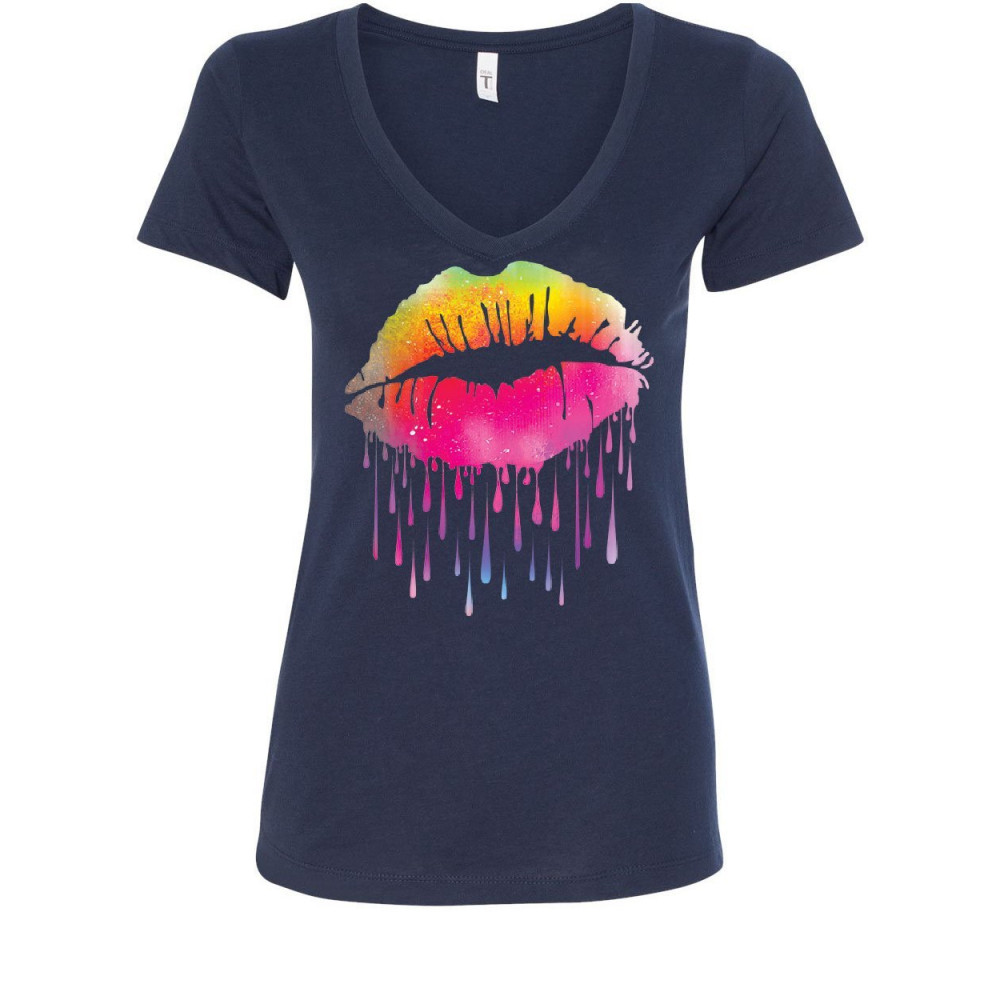 DRIPPING NEON LIPS women's v-neck t-shirt lips like sugar kiss love sexy melt navy blue