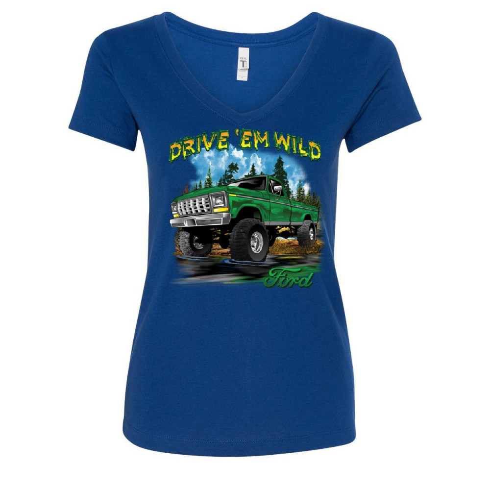 DRIVE 'EM WILD women's v-neck t-shirt ford pickup trucks f-150 offroad mud ride royal blue