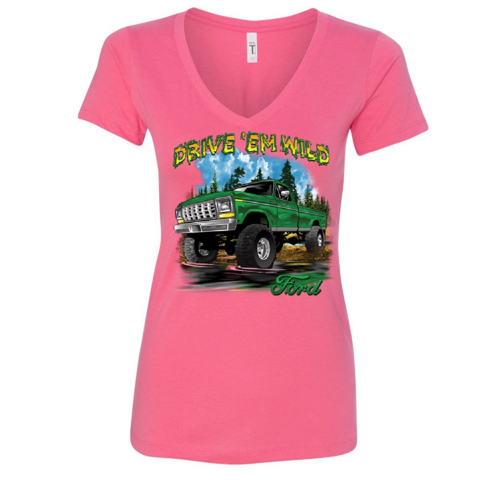 DRIVE 'EM WILD women's v-neck t-shirt ford pickup trucks f-150 offroad mud ride pink