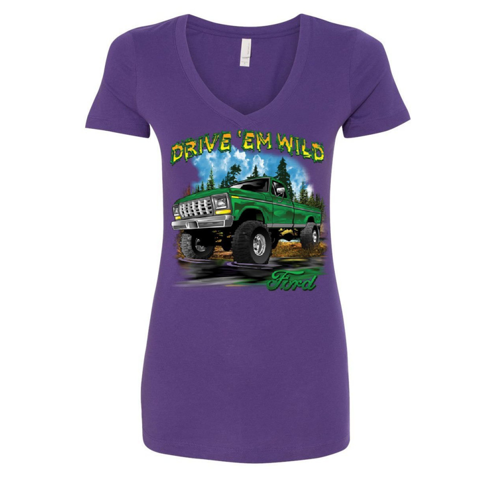 DRIVE 'EM WILD women's v-neck t-shirt ford pickup trucks f-150 offroad mud ride purple