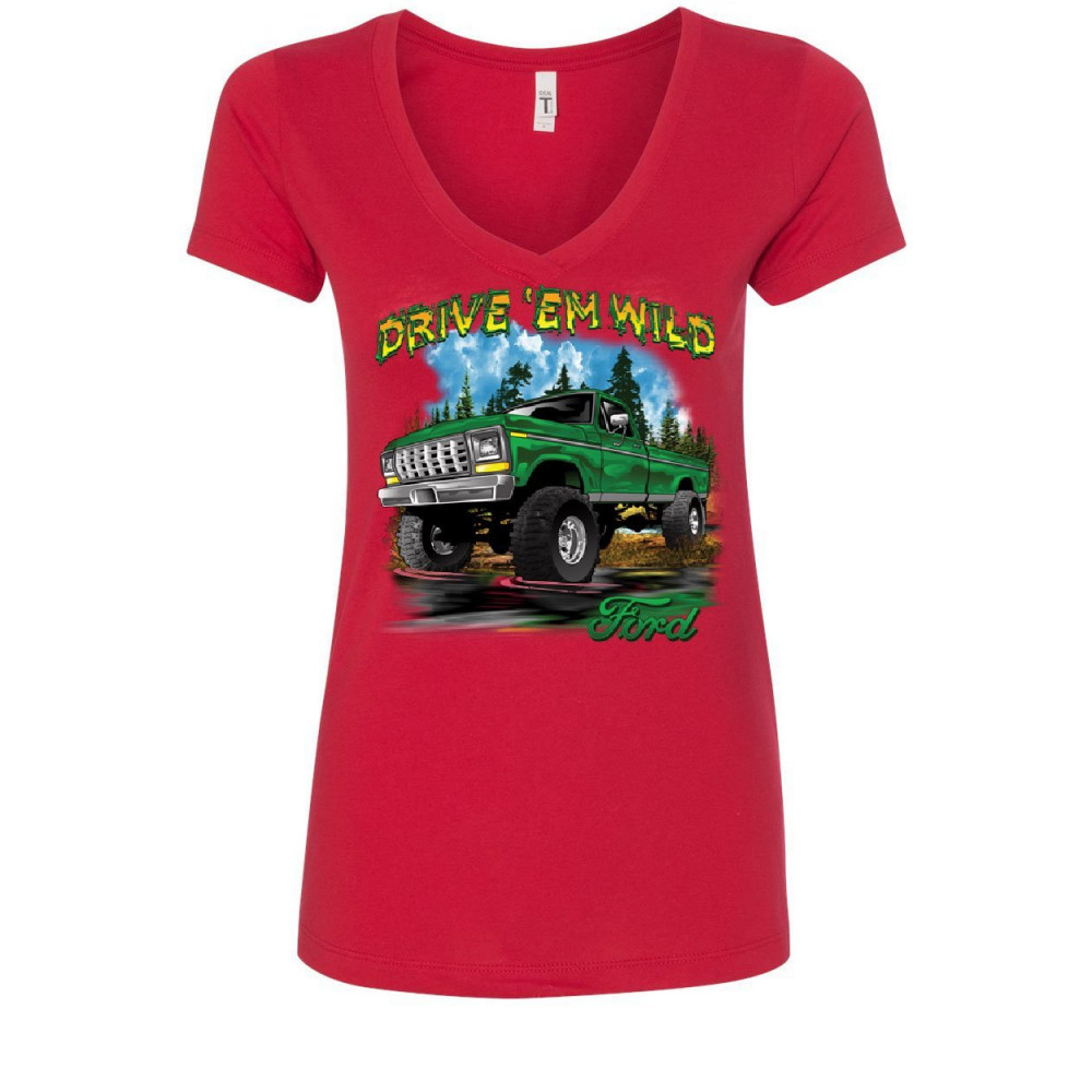 DRIVE 'EM WILD women's v-neck t-shirt ford pickup trucks f-150 offroad mud ride red