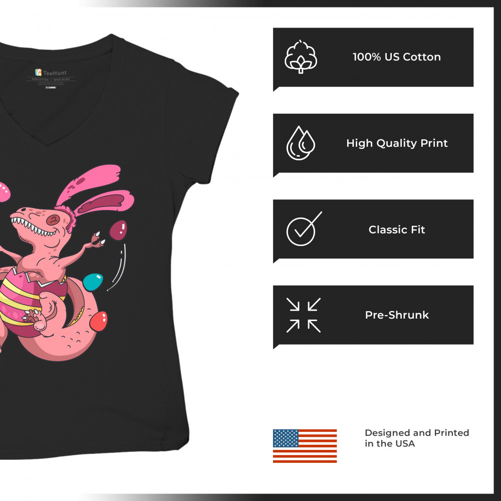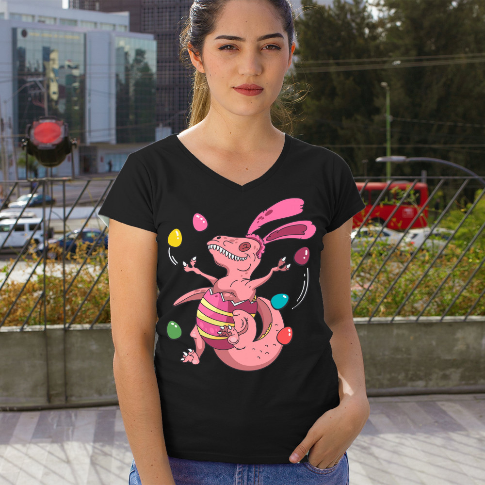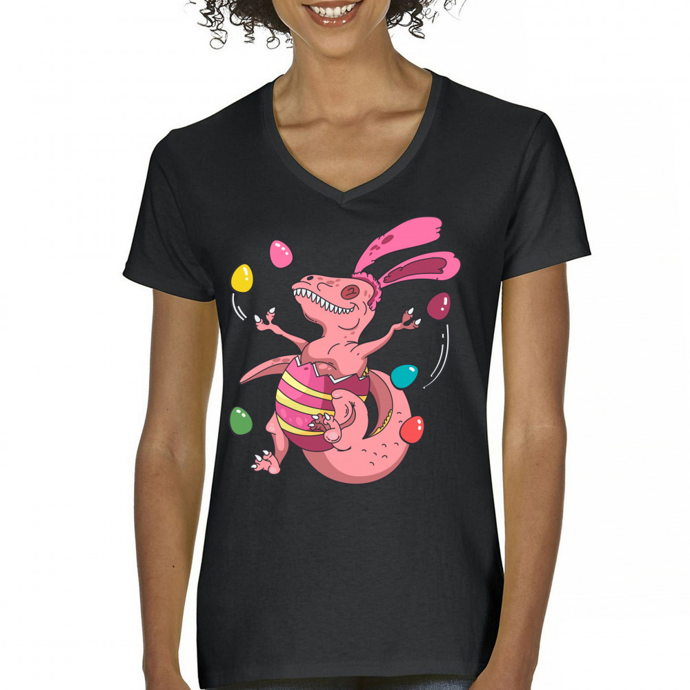 EASTER EGG T-REX women's v-neck t-shirt easter bunny dinosaur egg hunt tee black
