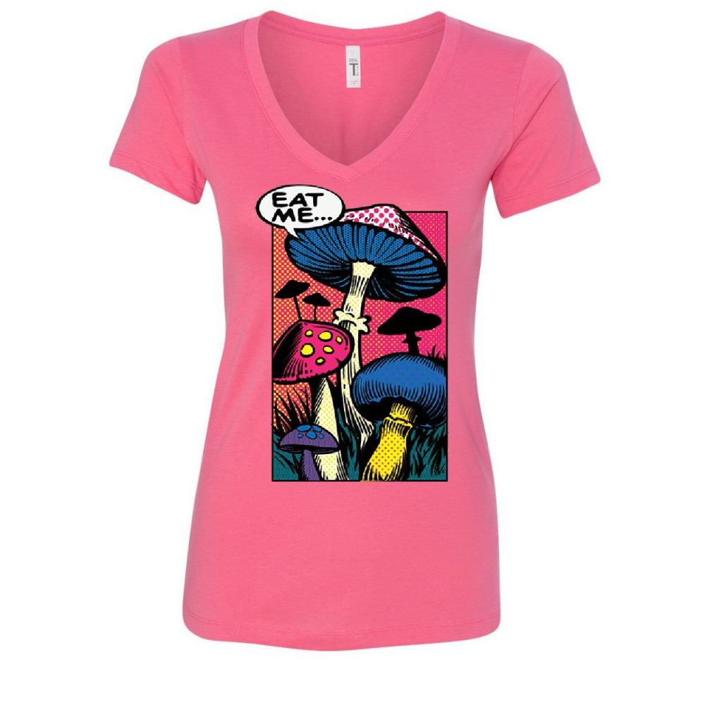 EAT ME... eat me women's v-neck t-shirt shroom mushroom fungi psychedelic hallucinations pink