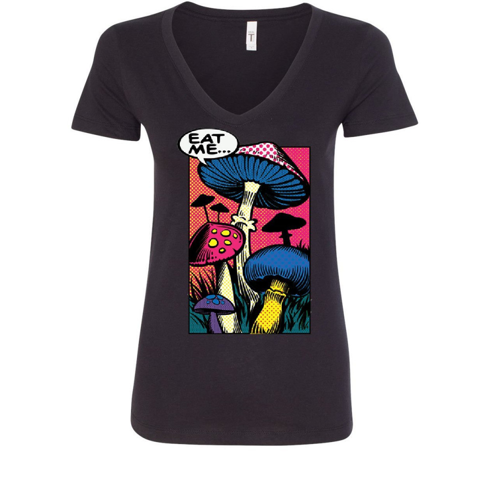 EAT ME... eat me women's v-neck t-shirt shroom mushroom fungi psychedelic hallucinations black
