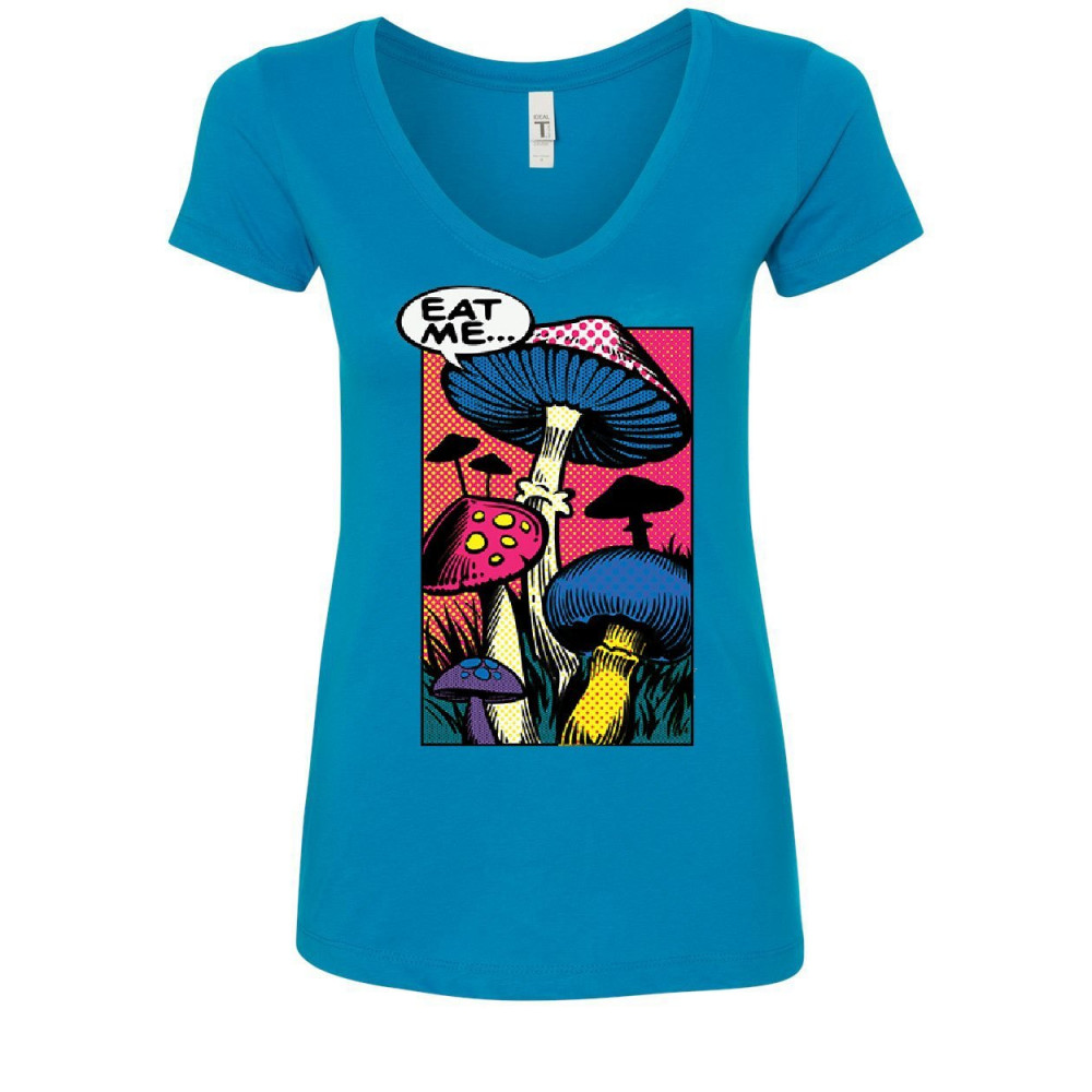 EAT ME... eat me women's v-neck t-shirt shroom mushroom fungi psychedelic hallucinations turquoise