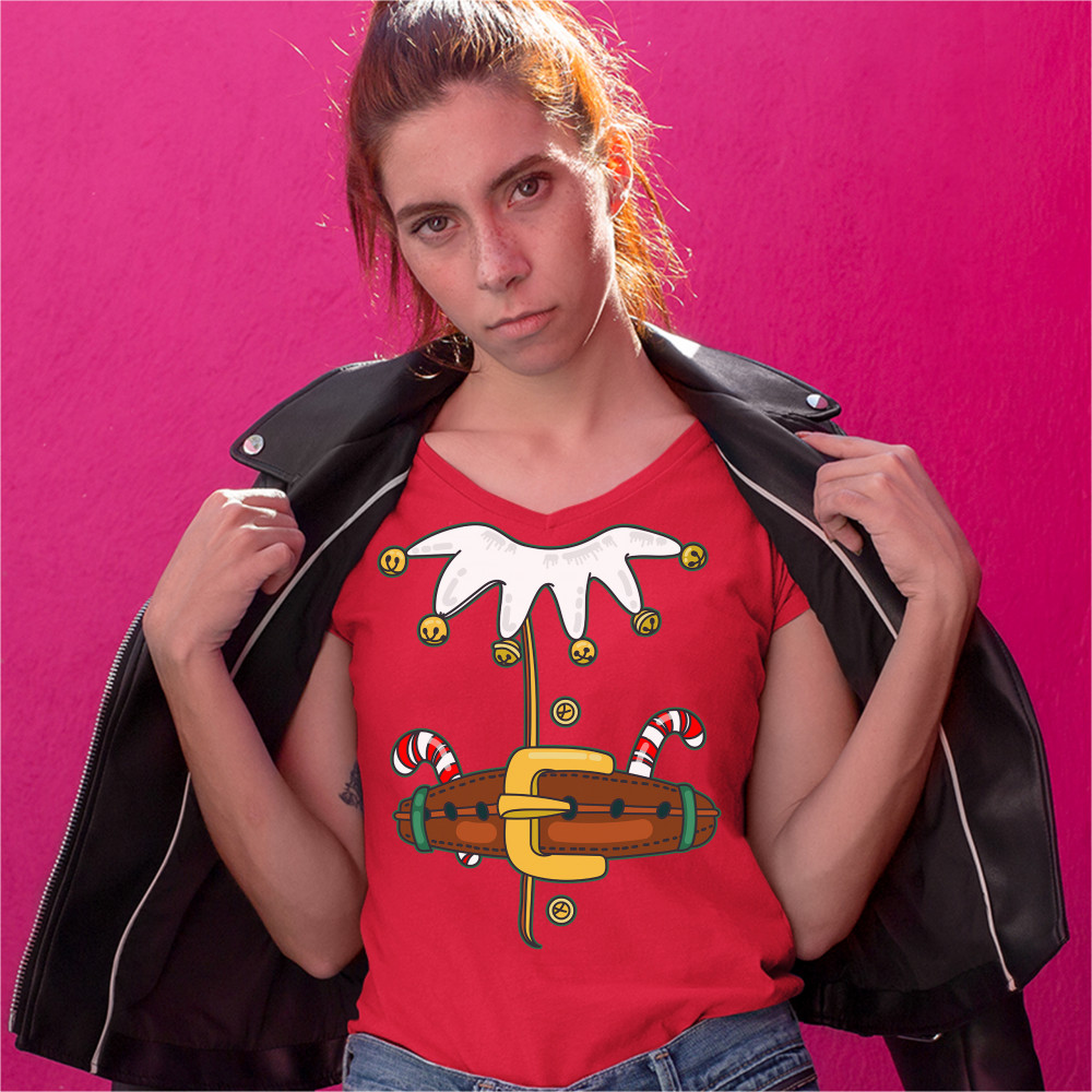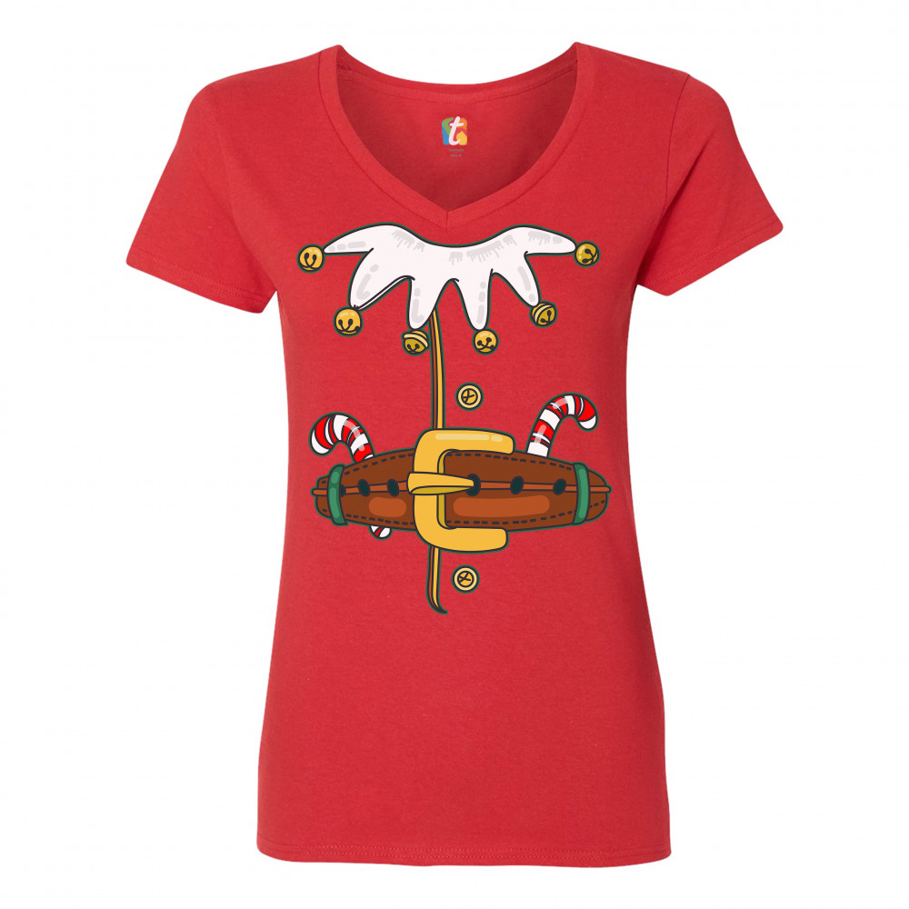 ELF COSTUME women's v-neck t-shirt merry christmas naughty or nice xmas tee red
