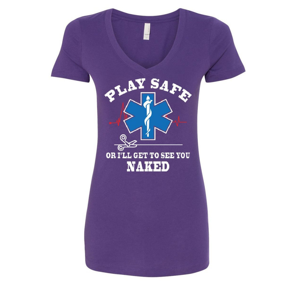 EMS PLAY SAFE OR I'LL GET TO SEE YOU NAKED women's v-neck t-shirt paramedic purple