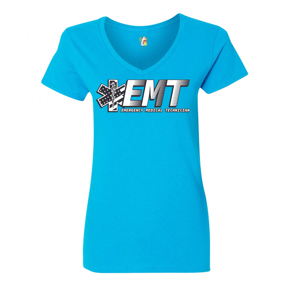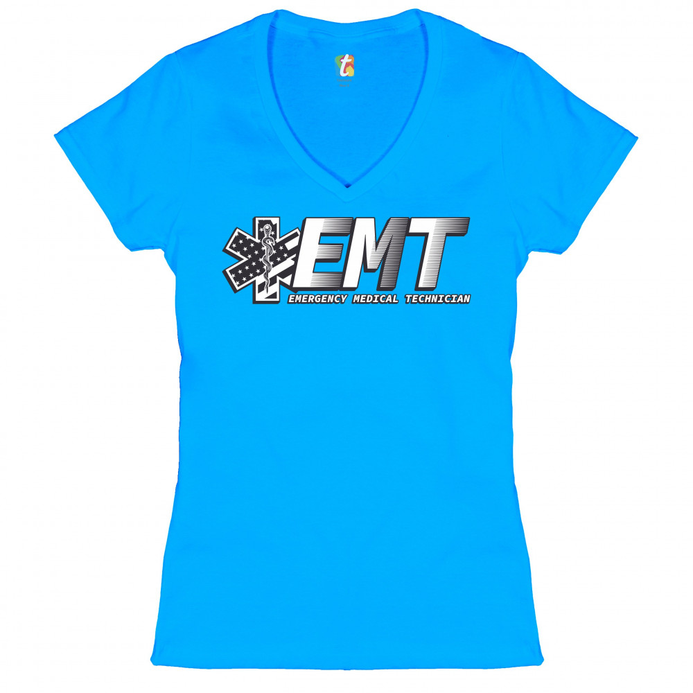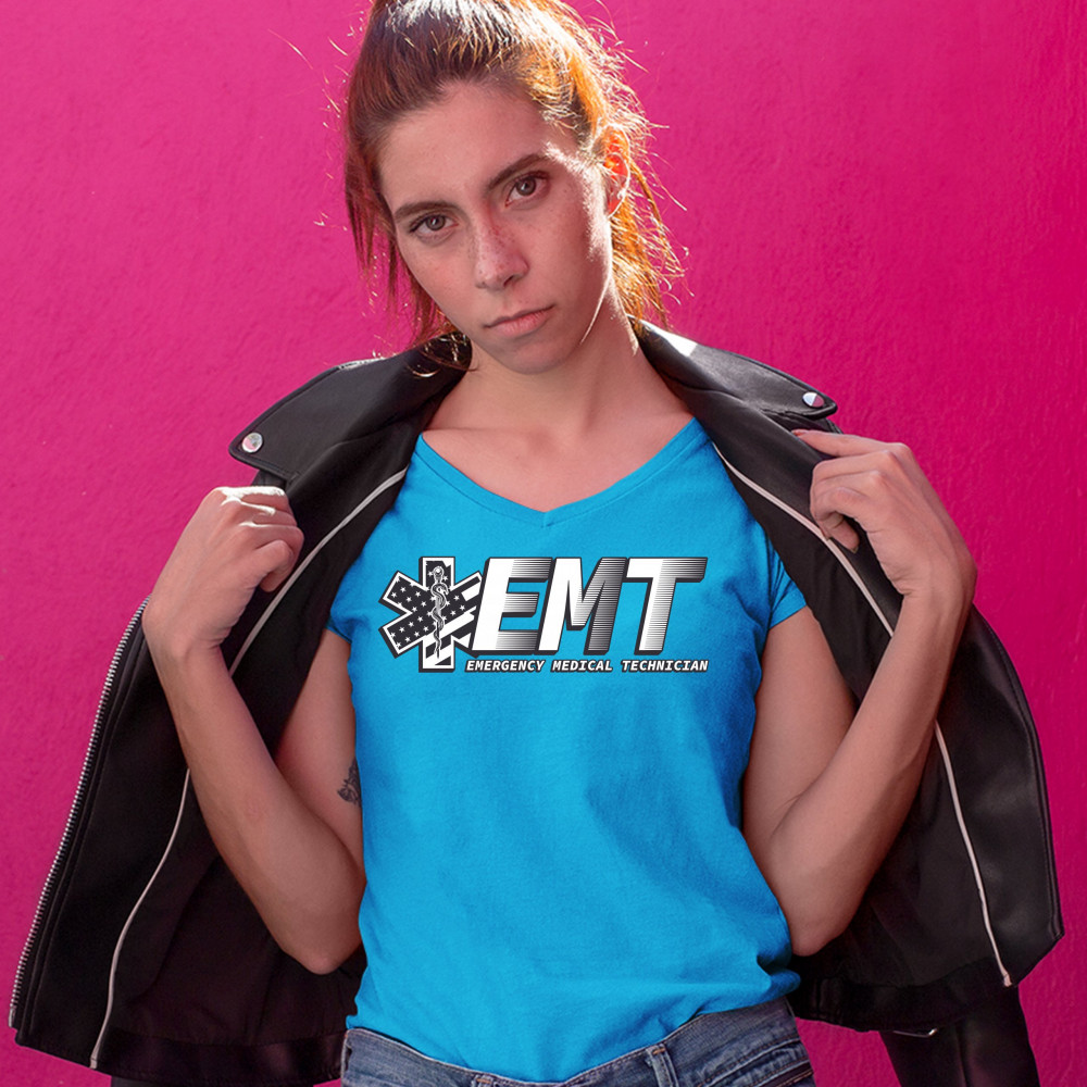 A print featuring big letters "EMT" - an abbreviation for "Emergency Medical Technician". On the left side the print features a Star of Life, the worldwide recognized symbol of emergency medical services, with the Rod of Asclepius and Stars and Stripes in