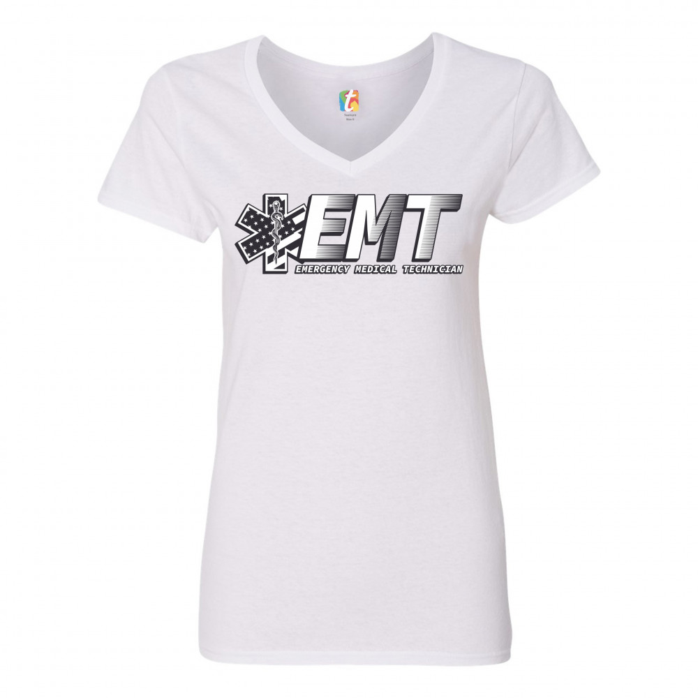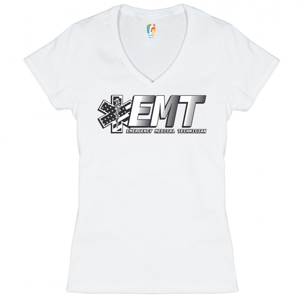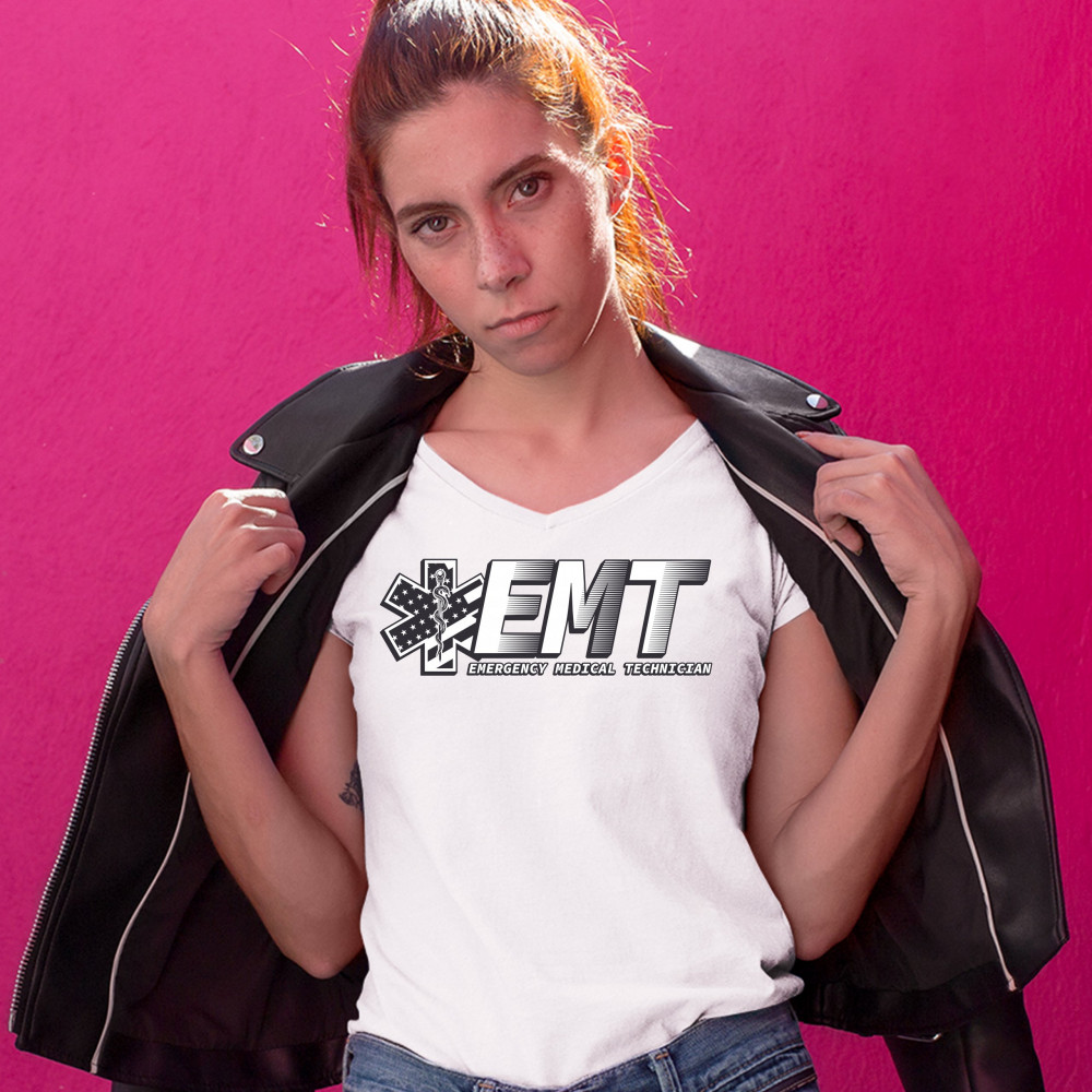 A print featuring big letters "EMT" - an abbreviation for "Emergency Medical Technician". On the left side the print features a Star of Life, the worldwide recognized symbol of emergency medical services, with the Rod of Asclepius and Stars and Stripes in