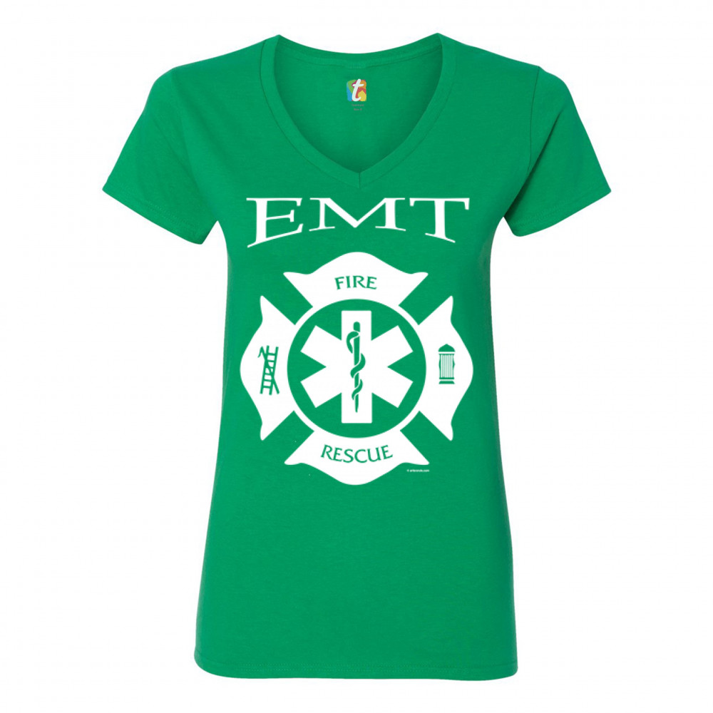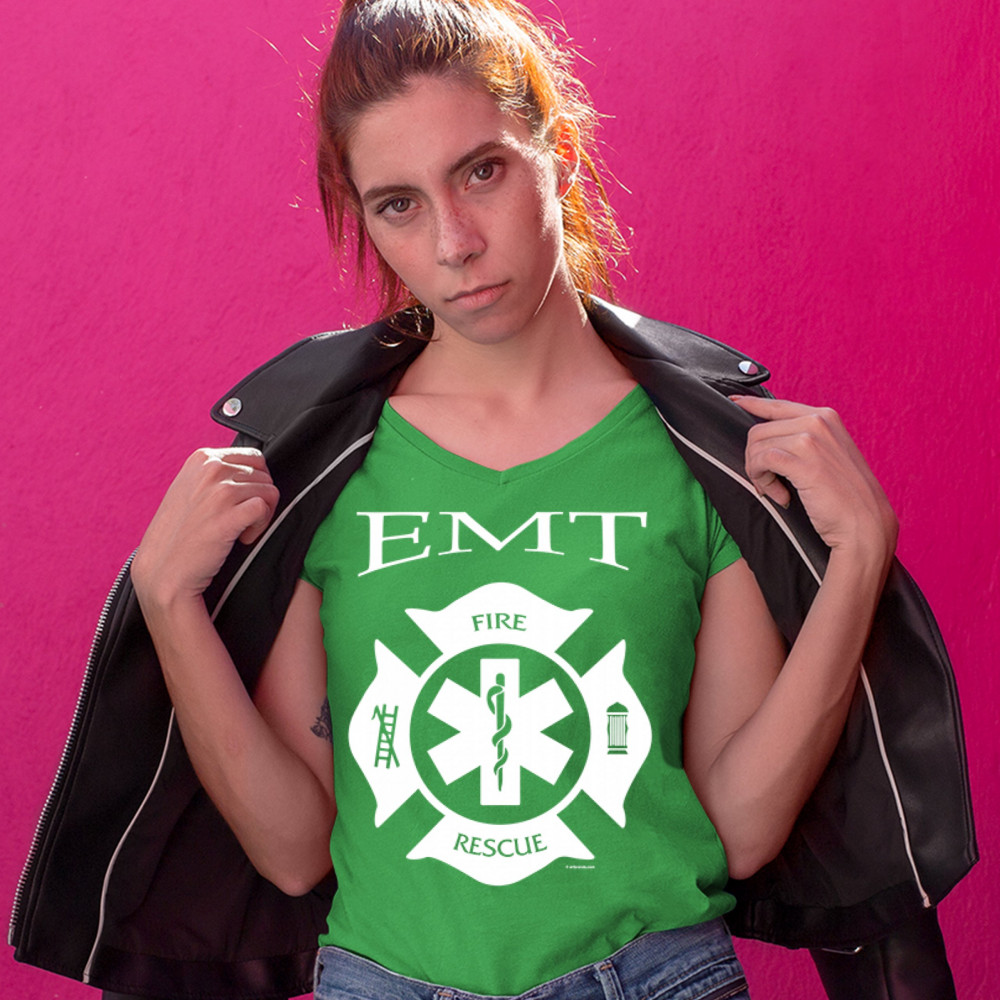 EMT FIRE AND RESCUE women's v-neck t-shirt emergency first responder ems tee green