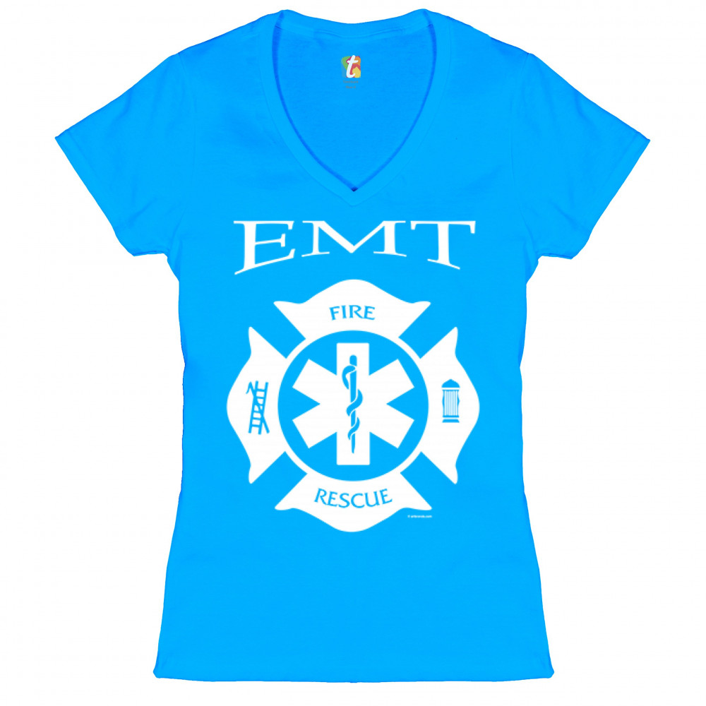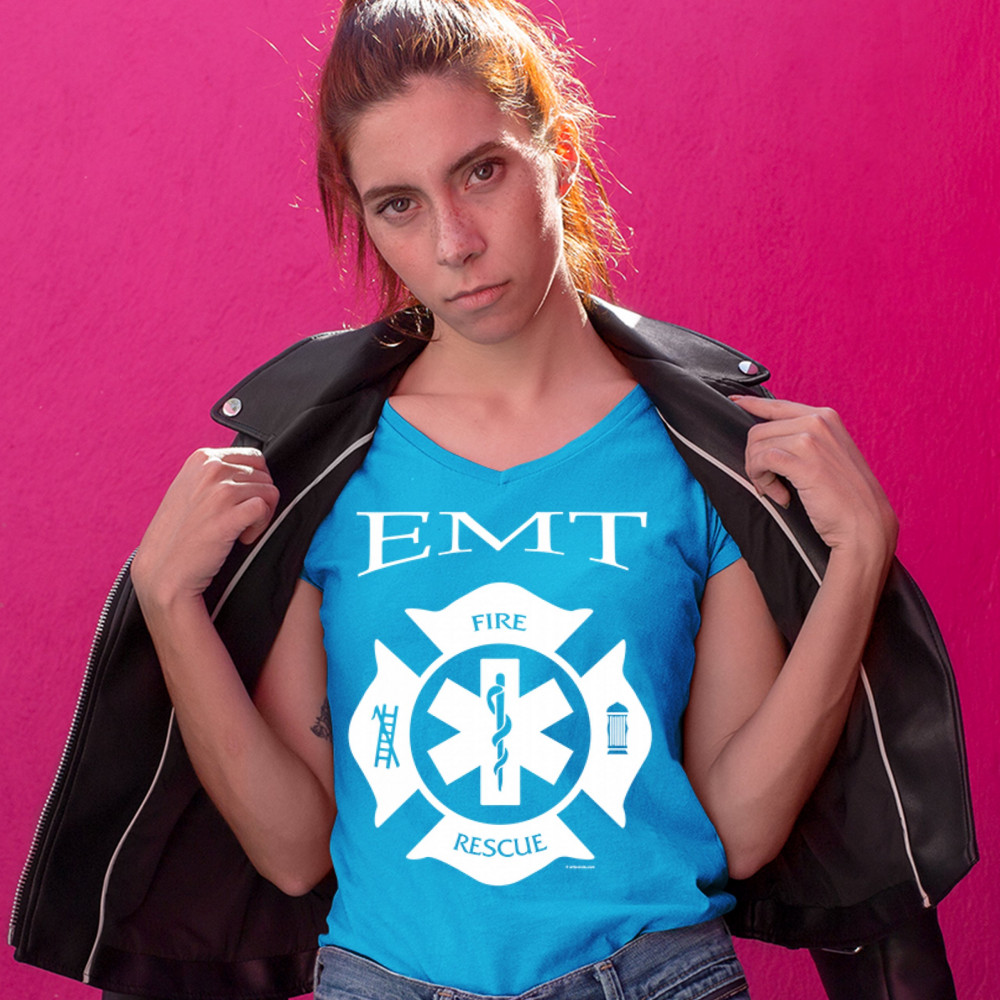 EMT FIRE AND RESCUE women's v-neck t-shirt emergency first responder ems tee turquoise