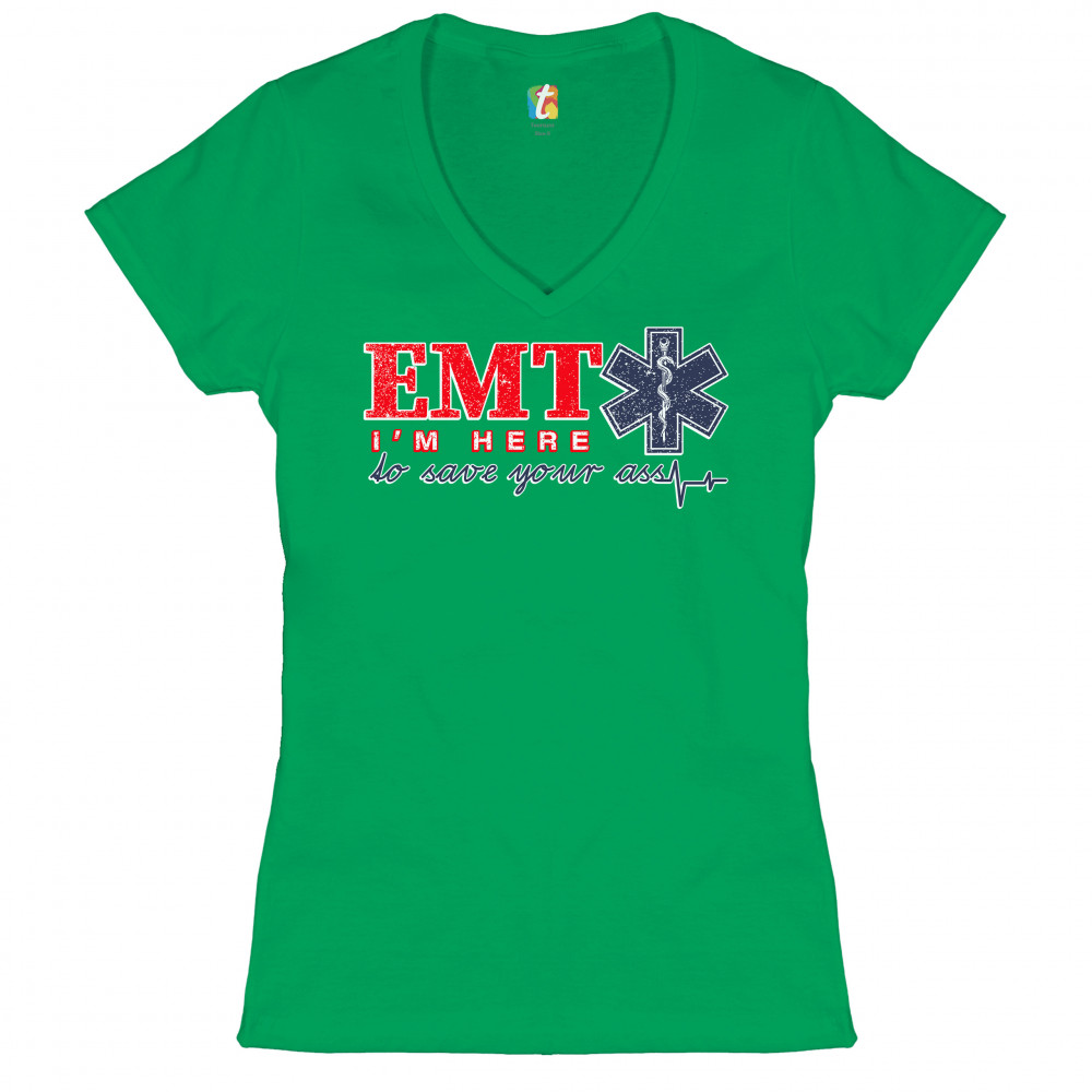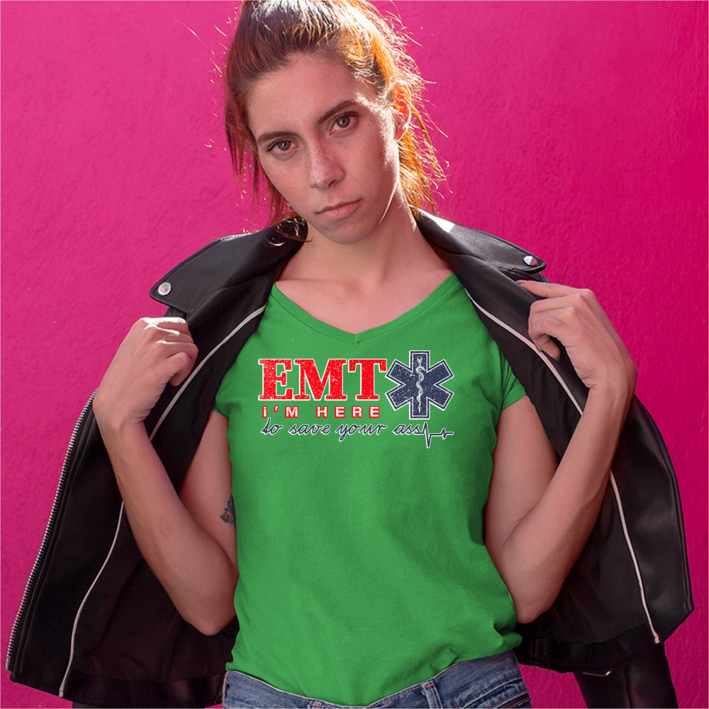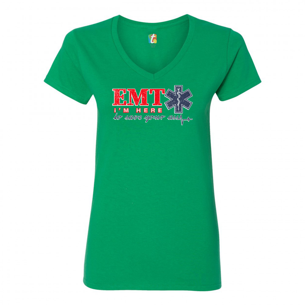 EMT I'M HERE TO SAVE YOUR ASS women's v-neck t-shirt ems medical assistant tee green